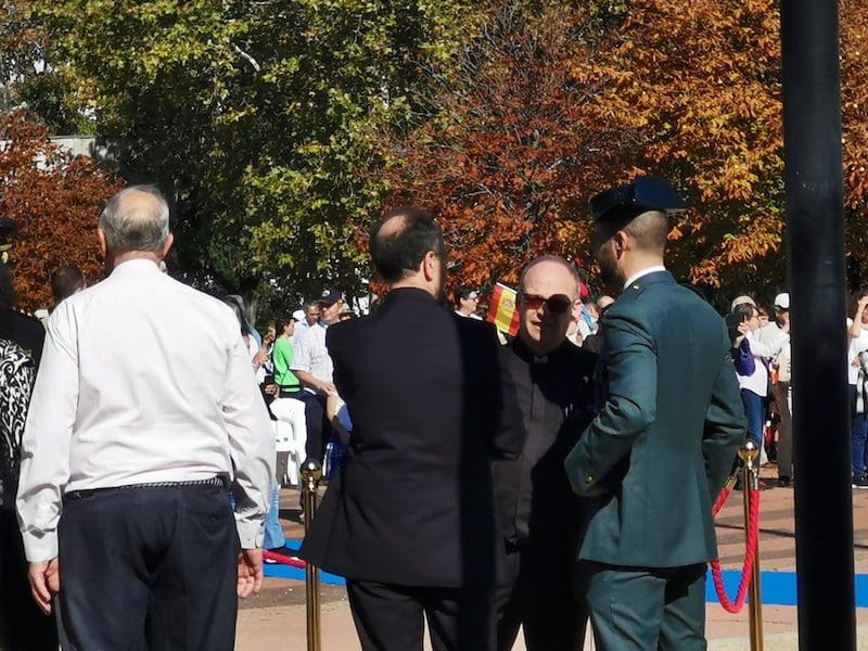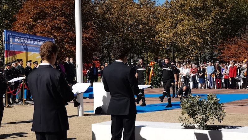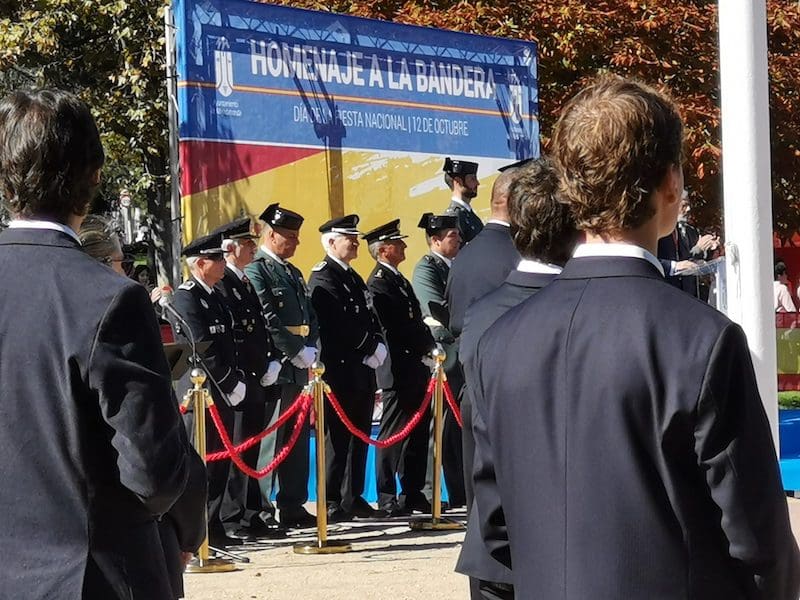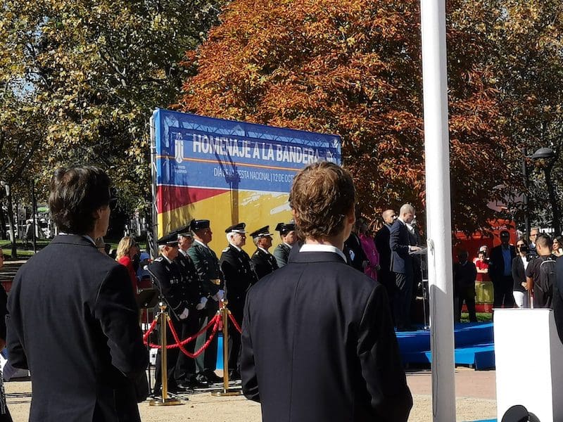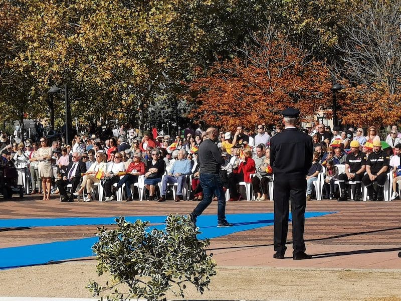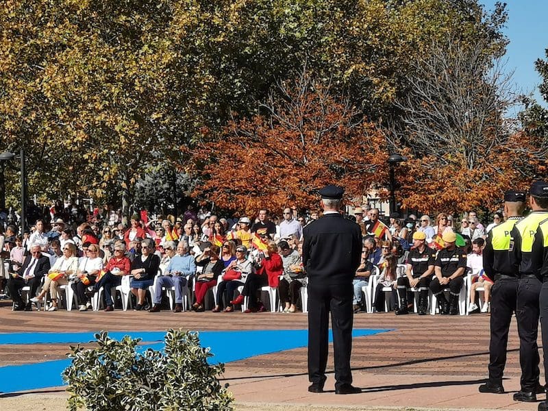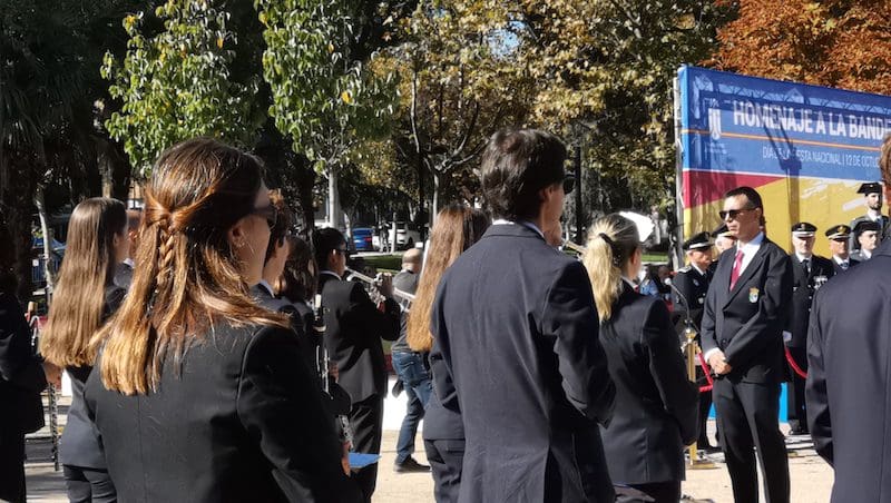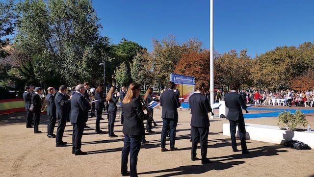 JULIA BACHILLER. Majadahonda celebró el tradicional «Homenaje a la Bandera» este miércoles 12 de octubre (2022) en el habitual lugar del Parque de Colón donde está situado el gran mástil donde luce la enseña nacional y bajo el cual un pequeño monolito recuerda a los que dieron su vida por ella. Un día en el que se celebra la Fiesta Nacional de España, el Día de la Hispanidad para toda el planeta de habla española, especialmente Hispanoamérica, y el Día del Pilar, patrona de la Guardia Civil. Por este motivo las actividades comenzaron antes del homenaje con una misa en la Parroquia del Beato Manuel Domingo y Sol para seguidamente dar comienzo a los actos programados. Ese acto principal en Colón registró una menor asistencia de público que en anteriores ocasiones, a pesar de lo cual la escasez de banderas que habitualmente se regalan a los asistentes fue algo que estos constataron, pues media hora antes del comienzo del acto ya se habían agotado. También se echó en falta la “entrega de los diplomas a los policías locales jubilados” que días antes anunciaba el Ayuntamiento y que finalmente no se produjo. Pero sin lugar a dudas los que brillaron en esta ocasión fueron los integrantes de la Banda Municipal de Música de Majadahonda, con Miguel Fernández de la Peña dirigiendo a estos acreditados músicos que no dejan de sorprendernos allá donde actúen, pues desde minutos antes del comienzo, durante el evento y al finalizar este, no dejaron de sonar agradablemente.