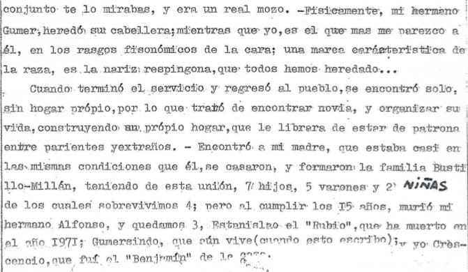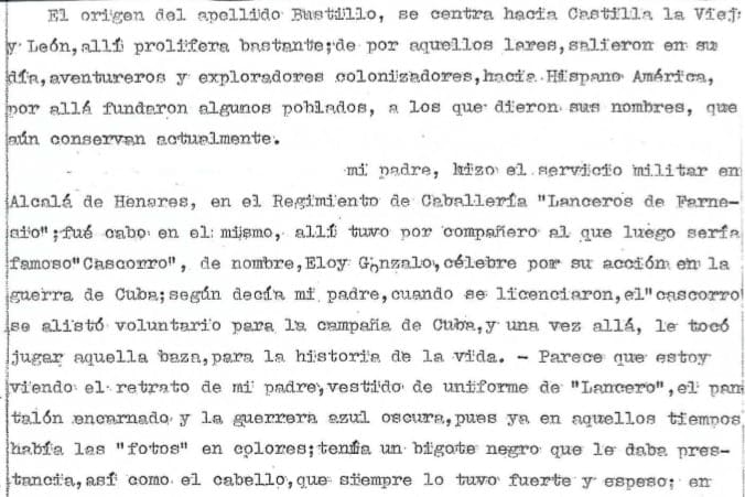 CRESCENCIO BUSTILLO. Mi padre nació el día 10 de julio de 1869, día de Santa Rufina, por eso le pusieron de nombre Rufino. Eran 3 hermanos, Lucio, Rufino e Isidoro, por este orden de nacimiento. Sus padres, o sea mis abuelos, se llamaban Lucio Bustillo y Andrea Calvo. Según parece no fue muy larga su existencia, pues primero mi abuelo, a quien apodaban «El Manduca», y después mi abuela, murieron sin ver a sus hijos criados. Mi abuelo los dejó pequeñitos y mi abuela también murió 6 u 8 años más tarde, quedando mi padre y mi tío Isidoro bajo tutela por ser menores de edad. De momento se quedaron con su hermano Lucio, que se había casado deprisa y corriendo con la tía Emilia. Tuvieron 2 hijos, no dando lugar a tener más, porque mi tío murió joven mientras mi padre hacía el servicio militar. La tía Emilia volvió a casarse poco después con el tío «Sin sombrero», pariente de mi madre, para así poder subir a sus hijos con la ayuda del nuevo marido … [Más información sobre Eloy Gonzalo, «el héroe de Cascorro» en Cuba y compañero de Rufino Bustillo de Majadahonda, a quien menciona en este artículo, pinchando aquí].