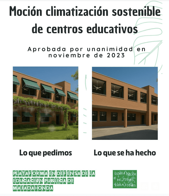 COMUNICADO DE LA PLATAFORMA DE EDUCACIÓN PÚBLICA (27-9-2025). Frente al cambio climático es urgente climatizar los centros educativos públicos de Majadahonda. El pasado 18 de septiembre el PP y Vox han rechazado con sus votos en la Asamblea de la Comunidad de Madrid la tramitación de la Iniciativa Legislativa Popular para la climatización de los centros educativos públicos. Esta Iniciativa contaba con el apoyo de más de 72.000 firmas y había sido promovida por la FAPA Giner de los Ríos, Comisiones Obreras, UGT y la Federación Regional de Asociaciones Vecinales de Madrid. Los votos favorables del PSOE y de Más Madrid no pudieron evitar su bloqueo perdiéndose así una oportunidad para preparar los centros educativos de la Comunidad de Madrid ante el cambio climático. En Majadahonda, en noviembre de 2023 se aprobó por unanimidad una moción presentada por la Plataforma en Defensa de la Educación Pública sobre la climatización de los coles. En ella se exigía al Gobierno del Ayuntamiento que tomara las medidas económicas y técnicas para lograr una climatización energéticamente sostenible de los centros escolares de su competencia, y que los servicios técnicos municipales conjuntamente con la comunidad educativa se encargaran de tomar las medidas que mejor se ajustaran a las características de cada uno de los colegios. Al mismo tiempo en la moción se sugerían también algunas medidas que se han tomado con éxito en otras ciudades como mejorar el aislamiento y dotar de persianas y toldos que limiten la insolación; reducir la superficie pavimentada de los patios y sustituirlas por superficies que absorban menos calor; plantar árboles de sombra para refrescar el ambiente, aumentar la humedad del aire y el suelo, reducir el CO2 y ofrecer refugio a la biodiversidad; e instalar nebulizadores. ¿Ha puesto en práctica el Ayuntamiento esta moción que se aprobó hace dos años? En absoluto. Los niños/as de nuestros colegios siguen tan desprotegidos frente al calor como lo estaban antes.
