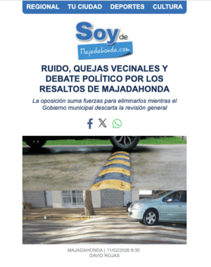 MANU RAMOS. (Majadahonda, 23 de febrero de 2026). Al Partido Popular (PP) le ha sentado muy mal la moción presentada por el grupo municipal de «Vecinos por Majadahonda» que solicitaba que se verificasen los «resaltos» de plástico instalados antes de los pasos de cebra porque varios vecinos expertos en la materia habían realizado informes técnicos que apuntaban una posible ilegalidad en su estructura. El motivo es que están proliferando quejas vecinales porque generan «ruido» al pasar los coches y molestan a las casas adyacentes, provocan riesgos de accidentes a motos y bicicletas, daños en las ruedas de los vehículos que los atraviesan aún cumpliendo la limitación de velocidad (el modelo elegido es el «picudo» en lugar de «circular«) e incluso lesiones en la espalda a los conductores y pasajeros que sufren un duro sobresalto al sobrepasarlos.