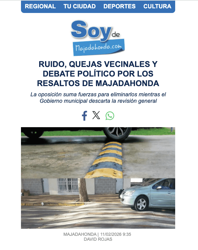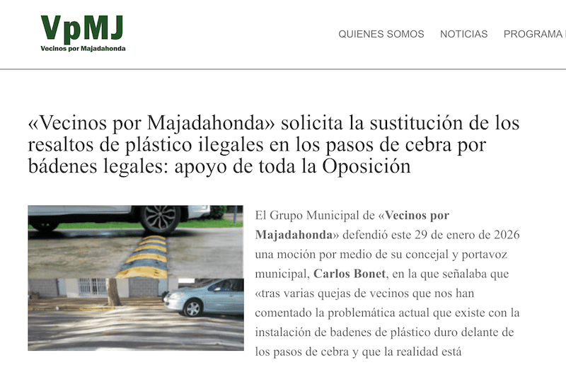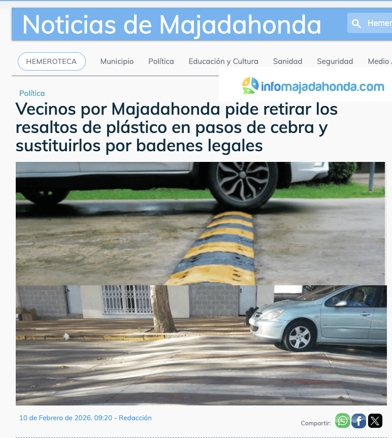 LA POLÉMICA MOCIÓN DE «VECINOS POR MAJADAHONDA» QUE HA IRRITADO AL PP . El Grupo Municipal de «Vecinos por Majadahonda» defendió este 29 de enero de 2026 una moción por medio de su concejal y portavoz municipal, Carlos Bonet, en la que señalaba que «tras varias quejas de vecinos que nos han comentado la problemática actual que existe con la instalación de badenes de plástico duro delante de los pasos de cebra y que la realidad está evidenciando que no son nada prácticos sino más bien molestos. Debido al ruido que hacen los vehículos cuando pasan por ellos y según el Reglamento General de Circulación del año 2003, consolidado a junio de 2025, en su Artículo 5 señala que este tipo de obstáculos «hay que hacerlos desaparecer lo antes posible», ya que los resaltos deben cumplir «la regulación básica establecida al efecto por el Ministerio de Fomento» y garantizar «la seguridad vial de los usuarios y, en particular, de los ciclistas». «ESTOS RESALTOS DE PLÁSTICO DE MAJADAHONDA NO CUMPLEN LA NORMATIVA ACTUAL DE LA DIRECCIÓN GENERAL DE TRÁFICO (DGT) y los ejemplos que nos han transmitido los vecinos afectados que además sufrimos todos, afecta a una zona de la Avenida de España, Carretera de Pozuelo, Avenida Príncipe de Asturias y otras calles como Neptuno que son un suplicio, con badenes encadenados uno detrás de otro. La zona de San Roque está también plagada y en la Avenida de las Moreras, frente al vado de vehículos de los números 17 a 23, existe otro badén de obra que incumple todas las dimensiones razonables. Lo mismo ocurre con el instalado en la calle Fresa, frente al Equinoccio, que tenía badenes de plástico normales y con el asfaltado han instalado los nuevos, tan molestos. Para su información, Pozuelo de Alarcón hace años también llenó sus calles de badenes de plástico (por lo menos eran los redondeados) y los ha acabado quitando. Como se indica en la moción, existe una normativa que regula las dimensiones de los badenes, que es la que debe usarse y los que no la cumplan deben retirarse, como señala el artículo 5 del Reglamento General de Circulación. Si se quieren instalar reductores, deben de ser en los pasos de peatones elevados con entrada suavizada y salida más todavía si cabe».