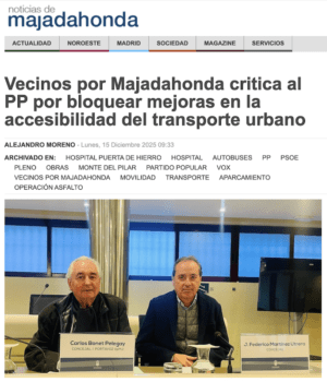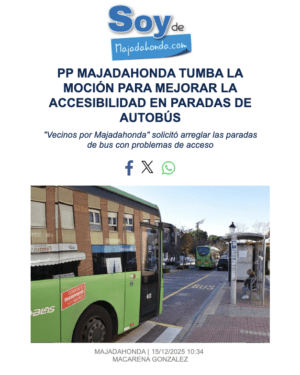 LA MOCION DE «VECINOS POR MAJADAHONDA» QUE MOLESTA AL PP: La moción del grupo municipal “Vecinos por Majadahonda” que solicitaba en el último pleno del Ayuntamiento celebrado el 27 de noviembre de 2025 un estudio municipal para dotar de mejoras de accesibilidad a las paradas de autobús que poseen deficiencias fue rechazada por los 15 votos de la mayoría absoluta del Partido Popular (PP) y apoyada por el resto de la Oposición formada por Vox (4), PSOE (3) y Más Madrid-IU (1), que sumados a los dos votos de los concejales vecinales Carlos Bonet (portavoz) y Federico Martínez (portavoz adjunto) alcanzaron los 10 votos. La propuesta de resolución decía que el pleno del Ayuntamiento solicita al Equipo de Gobierno «la realización de un estudio específico para que su conclusión, en el plazo de tiempo más breve posible, sirva de herramienta para la dotación de mejoras en la accesibilidad, sobre todo en usuarios con discapacidad y limitaciones de movilidad, en las paradas de autobús de Majadahonda que carezcan de espacio propio de estacionamiento para bajada y recogida de viajeros (se aporta plano oficial de los Transportes de Majadahonda). Dicho estudio servirá para habilitar zonas de aparcamiento propias para los buses y prohibidas para el resto de los vehículos privados junto a las marquesinas que así lo requieran por carecer de ellas».