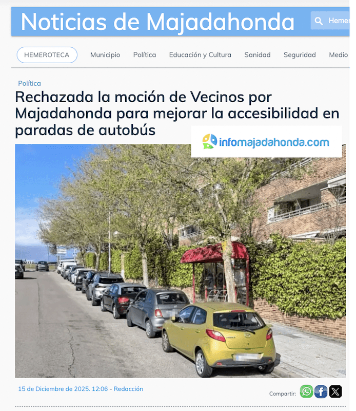 LA MOCION DE «VECINOS POR MAJADAHONDA» QUE MOLESTA AL PP: La moción del grupo municipal “Vecinos por Majadahonda” que solicitaba en el último pleno del Ayuntamiento celebrado el 27 de noviembre de 2025 un estudio municipal para dotar de mejoras de accesibilidad a las paradas de autobús que poseen deficiencias fue rechazada por los 15 votos de la mayoría absoluta del Partido Popular (PP) y apoyada por el resto de la Oposición formada por Vox (4), PSOE (3) y Más Madrid-IU (1), que sumados a los dos votos de los concejales vecinales Carlos Bonet (portavoz) y Federico Martínez (portavoz adjunto) alcanzaron los 10 votos. La propuesta de resolución decía que el pleno del Ayuntamiento solicita al Equipo de Gobierno «la realización de un estudio específico para que su conclusión, en el plazo de tiempo más breve posible, sirva de herramienta para la dotación de mejoras en la accesibilidad, sobre todo en usuarios con discapacidad y limitaciones de movilidad, en las paradas de autobús de Majadahonda que carezcan de espacio propio de estacionamiento para bajada y recogida de viajeros (se aporta plano oficial de los Transportes de Majadahonda). Dicho estudio servirá para habilitar zonas de aparcamiento propias para los buses y prohibidas para el resto de los vehículos privados junto a las marquesinas que así lo requieran por carecer de ellas».