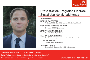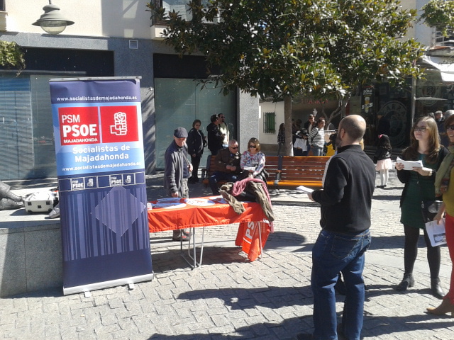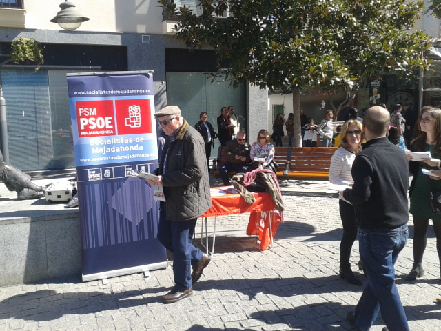 El PSOE de Majadahonda presenta a los ciudadanos majariegos este sábado 14 de marzo a las 11 de la mañana en la Casa de la Cultura «Carmen Conde» su programa electoral en el que, según pudo saber MJD Magazin en fuentes municipales, se van a incluir como ofertas varias materias novedosas. Entre ellas destacan la inclusión de Presupuestos Participativos (los ciudadanos debaten en un foro y consignan una parte de la inversión municipal), una auditoría de la deuda y de los gastos que han dejado los tres últimos alcaldes del PP (Romero de Tejada, Guillermo Ortega y Narciso de Foxá) y una radio municipal como canal movilizador de las actividades de la sociedad civil majariega. En el acto intervendrán Borja Cabezón, candidato a la alcaldía de Majadahonda, y los concejales y dirigentes Socorro Montes de Oca, Zacarías Martínez, María Elisa Piñana, Luis Ventura y Javier Vales. Después se servirá una copa de vino español a los asistentes, por lo que este sábado el PSOE majariego no saldrá a la Gran Vía, como hace cada fin de semana, para repartir sus folletos y dar a conocer a sus candidatos, momentos que recogen estas fotografías: