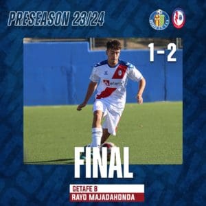 SILVIA ANULA. El Rayo Majadahonda de 1ª RFEF ponía rumbo a la Ciudad Deportiva de Getafe en la mañana de este sábado 12 de agosto para disputar lo que sería su cuarto partido de pretemporada frente al Getafe B (2ª RFEF). El equipo llegaba sobre las 8:30 horas, dispuesto y con todas las ganas de volver a sumar 3 puntos. El buen ambiente se palpaba en la Ciudad Deportiva para vivir una bonita mañana de fútbol. Eran las 9:30 horas, con 27 grados de temperatura, cuando el conjunto local ponía el balón en movimiento. Daba comienzo la primera parte y en los primeros compases de partido, concretamente en el minuto 10, remataba de cabeza el jugador rayista Reguera, pero lo atrapaba el guardameta Josele sin problemas para la cantera azulona. En el minuto 17, el conjunto rayista lanzaba su primer saque de esquina, pero sin peligro, pues seguía el 0-0 en el marcador de la Ciudad Deportiva Fernando Santos de la Parra.