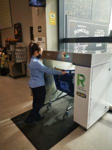 ITZIAR BLANCO. BM Supermercados ha dado un paso más en su compromiso con la seguridad y la prevención de las personas frente al COVID-19 poniendo en marcha un innovador sistema para desinfectar los carros de la compra, único en la Comunidad de Madrid. Se trata de una máquina de libre uso a disposición de los clientes, destinada a la desinfección del carro, así como de manos y calzado del usuario. El sistema consiste en un arco instalado en la entrada del supermercado en el que cada cliente coloca su carro de compra, y de forma automática y rápida, realiza la desinfección total del mismo (ruedas, interior y barra de agarre), así como de las manos y calzado del cliente. Para ello, la máquina utiliza un sistema de pulverización compuesto de un virucida específico para el COVID-19 y otros organismos patógenos. La pulverización se efectúa mediante unos aspersores que crean una nebulización compuesta por unas micro-gotas desinfectantes que alcanzan todas y cada una de las partes del carro, incluidas las manos de la persona que sujeta el carro. Asimismo, cuenta con una alfombra impregnada con el desinfectante para las ruedas del carro y las suelas del zapato del usuario.