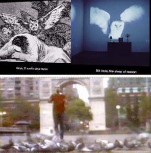 Hanhardt reduce las etapas a obras concretas, siendo la española representada por “El sueño de la Razón” (homenaje a Goya y a su grabado con el célebre búho) y “Habitación para San Juan de la Cruz”, en la que se escucha perfectamente audible el poema de Juan de Yepes como fondo, leídos por el videoartista español Francesc Torres: “Vivo sin vivir en mí, y de tal manera espero, que muero porque no muero…”. Y se abona a la leyenda negra de una sociedad española “corrupta y demente” denunciada por Goya. La crítica es bastante aproximada pero no menor que la que el propio Bill Viola hace en “Truth Through Mass Individuation” (La Verdad a Través de la Individuación de las Masas), cuando el domingo 26 de septiembre de 1976, a las ocho de la mañana exactamente, el videoartista se graba disparando con un rifle en la soledad nocturna de la esquina de las calles Cedar y Nassau, distrito de Wall Street. O cuando se sumerge en un estudio antropológico de un pueblo amerindio afincado en la reserva del Pueblo Navajo, Estado de Arizona, formada por unas 10.000 personas, con la misma curiosidad y cariño con que la pintora norteamericana Barbara Latham –a quien el videoartista le dedica su ensayo “History, 10 Years, and the Dreamtime”– dibujaba a los indios de Taos (Nuevo Méjico): “el pasado más profundo de América hay que buscarlo en “el otro”, una raza distinta de gente despojada de sus bienes o relegada. La idea distorsionada de que el paisaje natural está muerto (“materia inanimada”) es consecuencia del hecho de vivir en una tierra que no tiene una historia que contar”, escribe el videoartista.