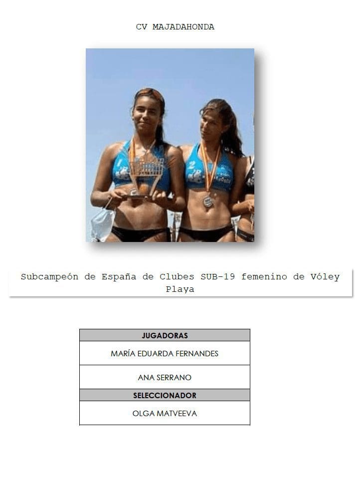 LIDIA GARCIA. El Voley de Majadahonda en sus dos modalidades (Voley Playa y Voleibol) está de enhorabuena este año 2021. Además de acaparar numerosos premios en la III Gala del Voleibol madrileño, siguen cosechando triunfos en sus competiciones individuales y por equipos. Además, en enero comienza la Liga Nacional de vóley playa en España, país pionero en empezar y se espera que los demás países lo vayan haciendo para así poder ir al Campeonato de Europa. El sorteo ya ha deparado los primeros cruces: CV Majadahonda juega con el VP Madrid (23-01-22), Switch Volley (13-02-22), Volei Praia Vigo (27-02-22), VB Sant Just (06-03-22), Getxo (20-03-22), CVP Poniente Benidorm (03-04-22), Beachbol La Malva (10-04-22). Los partidos como local se jugarán en La Sacedilla (Majadahonda).