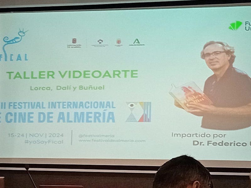 Los talleres que imparte el profesor Federico Utrera son audiovisuales e interactivos: participa el público, que puede preguntar e intervenir, y se realizan con vídeos y fotografías. En la imagen el realizado en 2024 sobre el videoarte de Federico García Lorca a propósito de su guión audiovisual titulado «Viaje a la Luna» (1929)