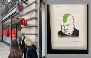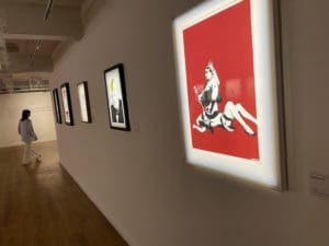 La exposición ofrece sus célebres «Girl With Balloon», en tres variaciones de color, «Flower Thrower», «Rude Copper» o el «Turf War» de Churchill