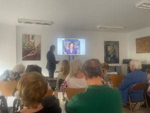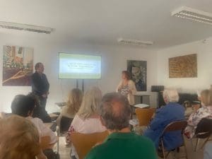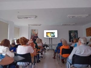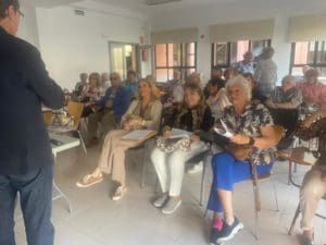 La sala de la Casa de la Cultura se llenó para oír la conferencia sobre Carmen de Burgos de Federico Utrera, autor de «Memorias de Colombine»