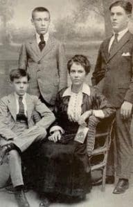 Córdoba, 1918 (20 años de la «incivil guerra»: la abuela de Fernando Arrabal, Concepción Ruiz, con sus tres hijos: el pequeño, sentado, Ángel, su padre, Fernando, en el medio, y su tío, Rafael, a su izquierda.