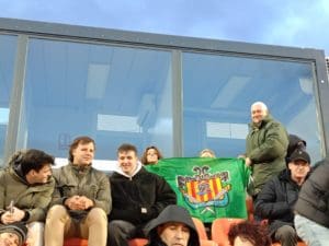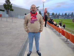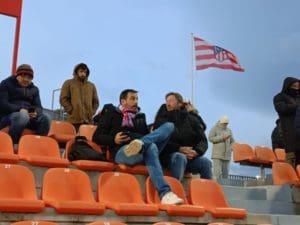 Manolo Hernández, otro «pata negra» e histórico de la afición, con un amigo majariego bromeando y llamándole «el inglés» por su típico gorro contra el frío