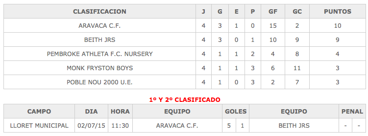 El tercer partido, con el equipo que por sorpresa se coló en la final, se disputó contra los escoceses del Beith JRS, localidad cercana a Glasgow, y concluyó con un abrumador 7-0 a favor de los madrileños. Lo peor fue la lesión de Alcañiz, que tuvo que regresar a Madrid con el tobillo fracturado. El último partido de grupos fue contra los catalanes del Poble Nou 2000 UE, club que juega en Tercera división de Cataluña. El resultado fue un ajustado 1-0 a favor del Aravaca, mínima victoria pero con 3 puntos que le metían en la final como campeón de grupo y favorito.