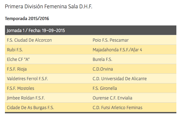 Por otra parte, el Comité Nacional de Fútbol Sala y la Real Federación Española de Fútbol ya han hecho públicos los calendarios deportivos oficiales de Primera y Segunda División de Fútbol Sala Femenino. En la máxima categoría la competición dará comienzo el 19 de septiembre, tras la disputa de la XIII Supercopa de España entre Atlético Féminas Navalcarnero y el Burela FS Pescados Rubén, y finalizará el 4 de junio de 2015.