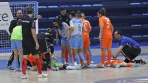 «Choque brutal en el partido de primera división entre el Marín Futsal y el Rayo Majadahonda. Se llevan a la portera del Marín a Patri Arruti en ambulancia tras un choque con una jugadora del equipo majariego en el partido de fútbol sala femenino en el pabellón de A Raña» titula ©La Voz de Galicia (Capotillo)