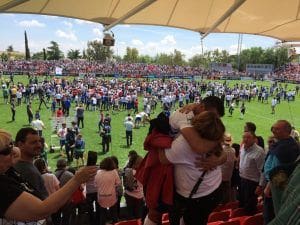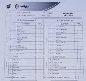 Tras finalizar la primera parte los asistentes al palco se retiraron a la sala de prensa para recibir un rápido refrigerio. Dos concejales de Ciudadanos, su portavoz Ana Elliot y Alfonso Reina, guardaron cola para adquirirlos y tampoco ocuparon su lugar en el palco y se situaron en la grada. En el caso de la portavoz en compañía de su familia, como así nos indicó al saludar a la entrada. Final del partido con caras de decepción entre los seguidores del Cartagena y rápido desalojo de las localidades, pero invasión del campo, aplausos y gritos de alegría para los del Rayo. En las gradas se encontraban los familiares de algunos jugadores: la familia de Jairo Cárcaba con su madre Rocío, gran aficionada y seguidora, que no contuvo la emoción tras pitar el final del partido junto a su marido y su hija que la acompañaban. Algo más retirado de este lugar Álvaro Rodríguez, que se abrazaba muy emocionado a su familia sin poder contener las lágrimas. Recordar que este jugador, como él mismo nos contó en su presentación, estaba muy agradecido al club porque cuando lo ficharon estaba lesionado y a pesar de eso realizaron el traspaso. El presidente Enrique Vedia, muy emocionado y abrazado por algunos asistentes, fue difícil de acceder. Abandonando ya las instalaciones del Cerro del Espino felicitamos al entrenador Antonio Iriondo que entraba a la rueda de prensa y al que paraban para fotografiarse con él y felicitarlo todos los que lo encontraban a su paso. Ya en el exterior tuvo lugar otro pequeño incidente, pero sin consecuencias: dos aficionados del Cartagena discutían entre sí por una fotografía, que uno de los presentes no estaba de acuerdo en inmortalizar, lo que terminó en discusión. Durante la tarde se siguieron oyendo en la Gran Vía la celebración de los seguidores del Rayo, algunos de ellos aun con la resaca de celebrar la victoria del Real Madrid el día anterior.