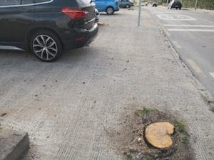JULIA BACHILLER. Algunos vecinos de Majadahonda se sorprendieron este pasado jueves 30 de enero (2020) cuando a primera hora de la mañana, a su paso por la calle del cementerio, visualizaron a algunos operarios con sierras eléctricas realizando junto a un gran camión la tala de varios árboles que se encontraban en la acera que discurre en el tramo comprendido entre las salas del tanatorio y el antiguo centro de jardinería “Los Almendros”, junto a la carretera de Boadilla del Monte. En total han sido 6 los árboles talados, de los que los denunciantes desconocen la especie a la cual pertenecían. Estaban situados en la zona más cercana junto a la carretera y bajo los cables de alta tensión que cruzan esta zona. Tras visualizar la zona donde se ha realizado la tala, puede comprobarse que se trataba de varios árboles, algunos muy cercanos a la carretera, que no poseían ningún cuidado ni mantenimiento por parte del Ayuntamiento. Las especies no gozaban de riego alguno e incluso estaban cubiertos en su base por una capa de cemento. En los visibles tocones puede comprobarse que tres de ellos estaban huecos en su interior, afectados por hongos o insectos.