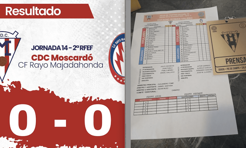 FICHA TECNICA. Moscardó: Guille; Víctor, Campos, Adrián Jiménez, Asier; Albur, Pedro Torres (Molina 79’), Reguera, Isra (Borja Paris 63’); Borona (Abreu 26’), Siverio. Rayo Majadahonda: Prieto (2), Durán (2), Dani Ramos (2), Amaro (2), Gordo (2), Koke (2), Dani Vidal (3), Yuya (2), Pol (1), Plomer (2), Ilies (2). Sustituciones: Cheik (2), Iñigo (2), Alex García (2), Carmona (3), Fran Pérez (2). Entrenador: Guille Fernández (2). Árbitro: Alejandro Tomé Alonso (colegio grancanario). Amarilla a Víctor, Adrián Jiménez, Isra, Abreu; Javi Gordo y Dani Vidal. Incidencias: Román Valero. Unos 600 espectadores.