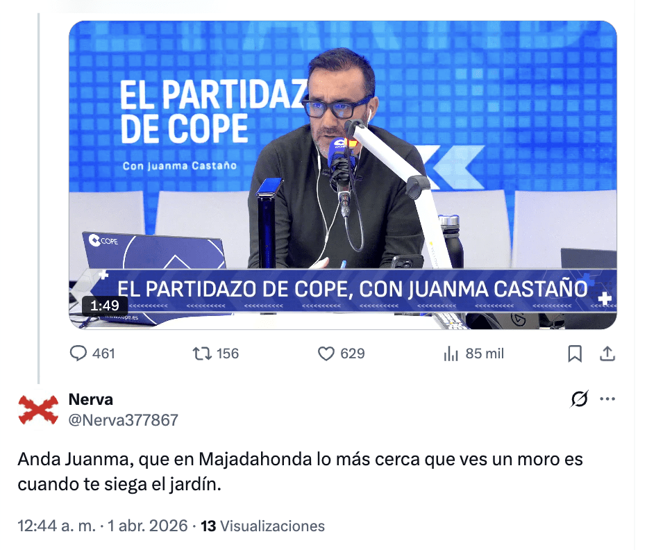 MANU RAMOS. (Majadahonda, 2 de abril de 2026). El periodista deportivo de la Cadena Cope y vecino de Majadahonda (Madrid), Juanma Castaño, ha acaparado los titulares de numerosos periódicos por su discurso contra el racismo tras lo ocurrido en el partido España-Egipto disputado esta semana en el estadio barcelonés de Cornellá (Barcelona). «Juanma Castaño no da crédito a lo que le ha pasado en las últimas horas tras el España-Egipto: «Alucino». El periodista de la cadena Cope está sorprendido por la respuesta a sus comentarios condenatorios por los gritos islamofóbicos registrados en el RCDE Stadium» (Mundo Deportivo). «Juanma Castaño se echa las manos a la cabeza por lo sucedido en el RCDE Stadium: «La imagen de Lamine es desoladora». El presentador de ‘El Partidazo de COPE’ alzó la voz para condenar los insultos racistas» (Sport). Y entre el torrente de comentarios, la mayoría a su favor, también han surgido otros en contra, precisamente desde Majadahonda, la ciudad donde vive: «Anda Juanma, que en Majadahonda lo más cerca que ves un moro es cuando te siega el jardín».
