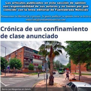 CARMEN ESTEBAN. Este sábado 19 de septiembre de 2020 decidí dar un paseo por mi barrio en Getafe, con la intención de aprovechar los últimos días previos al inicio de los confinamientos de clase en la Comunidad de Madrid. No tenía nada que hacer en especial, pero noté la calle distinta, se respiraba tensión en las avenidas. La gente llevaba el ceño más fruncido de lo normal, y es que aunque seamos de enfado fácil siempre ofrecemos una sonrisa. Las conversaciones de los bancos parecían tertulias políticas, allá donde mirara veía y escuchaba indignación con la clase política. Y yo me preguntaba: ¿cómo hemos llegado hasta aquí? Hemos llegado hasta el punto de ignorar sin disimulo a la población, sin descaro. La población madrileña no cuenta, bueno, mejor dicho, la clase obrera. Nadie entendía cómo se había decidido confinar Getafe teniendo igual o menor índice de contagios que zonas como Madrid centro. Aunque una idea rebotaba por las cabezas de los getafenses, y era que les habían confinado por ser más pobres que el resto. Parece algo digno de la época feudal o de los Reyes Católicos, pero no, estamos ante una política actual de Ayuso y Aguado. La plebe o los campesinos siguen viviendo sometidos a la nobleza. Y es que aunque el Barrio de Salamanca o Majadahonda estén en las mismas condiciones que los distritos confinados, en ellos reside la nobleza, la clase alta, los intocables.