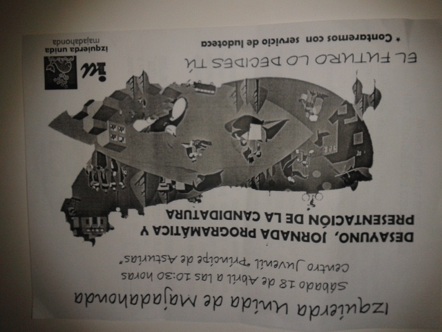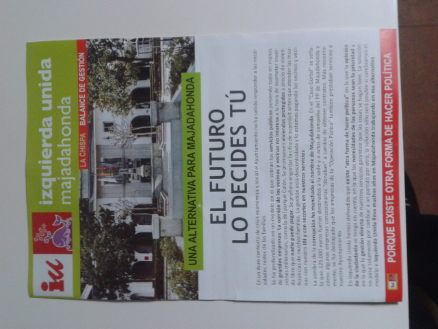Lola Sánchez, Gonzalo Caro y Héctor Muñoz, candidatos de Izquierda Unida Majadahonda, salieron este fin de semana a la Gran Vía para explicar sus principales propuestas en diversos folletos explicativos con los que han iniciado la precampaña electoral. Además, emplazaron a los vecinos a acudir este sábado 18 de abril a las 10;30 horas al centro juvenil «Príncipe de Asturias» para invitarles a un desayuno en el que realizarán una jornada sobre el programa electoral y presentarán su candidatura, contando además con un servicio de ludoteca para aquellos que vengan acompañados de niños. Ofrecemos una muestra de sus principales folletos que fueron distribuidos por las calles majariegas, así como uno de sus más populares lemas dirigido al alcalde de Majadahonda: