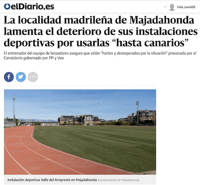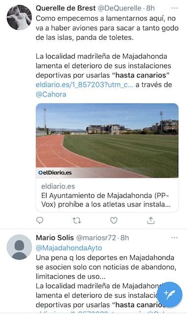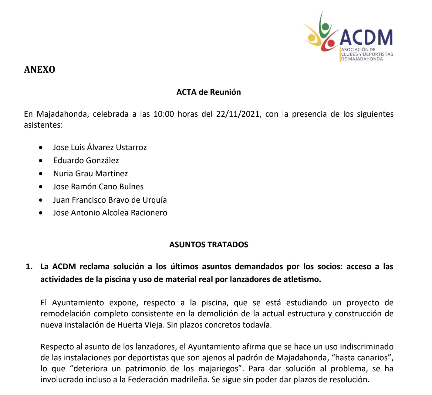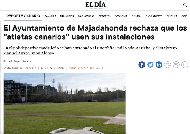 COMUNICADO DE LA ASOCIACION DE CLUBES Y DEPORTISTAS DE MAJADAHONDA (ACDM). Acta de la Reunión. «En Majadahonda, celebrada a las 10:00 horas del 22/11/2021, con la presencia de los siguientes asistentes: Jose Luis Álvarez Ustarroz, Eduardo González, Nuria Grau Martínez, Jose Ramón Cano Bulnes, Juan Francisco Bravo de Urquía y Jose Antonio Alcolea Racionero. ASUNTOS TRATADOS: La ACDM reclama solución a los últimos asuntos demandados por los socios: acceso a las actividades de la piscina y uso de material real por lanzadores de atletismo. El Ayuntamiento expone, respecto a la piscina, que se está estudiando un proyecto de remodelación completo consistente en la demolición de la actual estructura y construcción de nueva instalación de Huerta Vieja. Sin plazos concretos todavía. Respecto al asunto de los lanzadores, el Ayuntamiento afirma que se hace un uso indiscriminado de las instalaciones por deportistas que son ajenos al padrón de Majadahonda, “hasta canarios”, lo que “deteriora un patrimonio de los majariegos”. Para dar solución al problema, se ha involucrado incluso a la Federación madrileña. Se sigue sin poder dar plazos de resolución». Vea todas las reacciones suscitadas por las palabras del concejal de Deportes de Majadahonda pinchando sobre las imágenes para aumentar su tamaño: