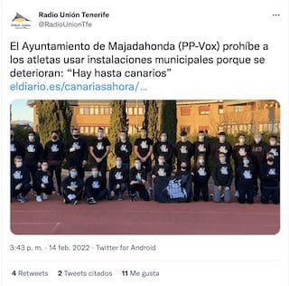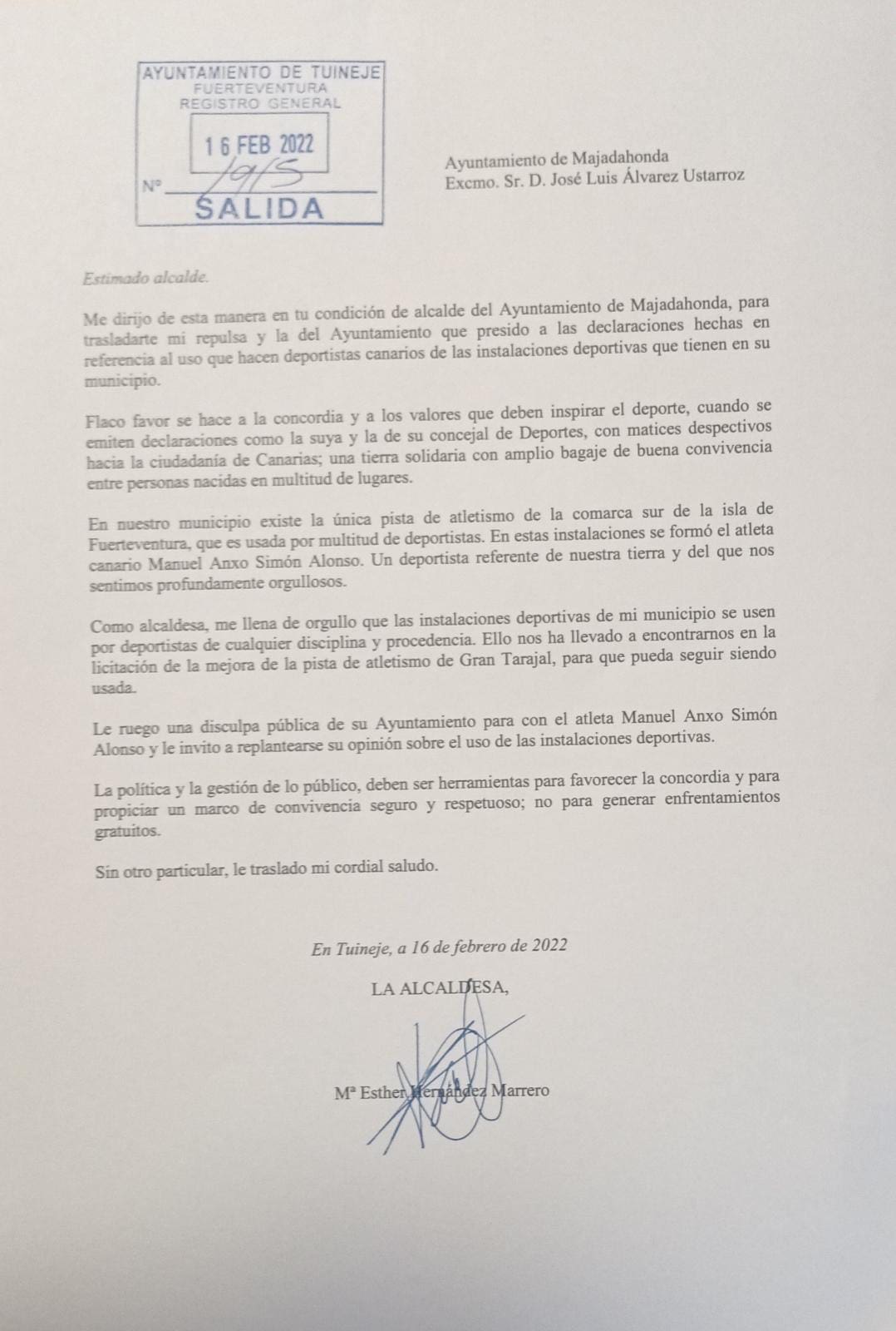 CARTA DE LA EX SENADORA Y ALCALDESA CANARIA DEL PP: «Estimado alcalde. Me dirijo de esta manera, en tu condición de alcalde del Ayuntamiento de Majadahonda, para trasladarte mi repulsa y la del Ayuntamiento que presido a las declaraciones hechas en referencia al uso que hacen deportistas canarios de las instalaciones deportivas que tienen en su municipio. Flaco favor se hace a la concordia y a los valores que deben inspirar el deporte cuando se emiten declaraciones como la suya y la de su concejal de Deportes, con matices despectivos hacia la ciudadanía de Canarias; una tierra solidaria con amplio bagaje de buena convivencia entre personas nacidas en multitud de lugares. En nuestro municipio existe la única pista de atletismo de la comarca sur de la isla de Fuerteventura, que es usada por multitud de deportistas. En estas instalaciones se formó el atleta canario Manuel Anxo Simón Alonso. Un deportista referente de nuestra tierra y del que nos sentimos profundamente orgullosos. Como alcaldesa, me llena de orgullo que las instalaciones deportivas de mi municipio se usen por deportistas de cualquier disciplina y procedencia. Ello nos ha llevado a encontrarnos en la licitación de la mejora de la pista de atletismo de Gran Tarajal, para que pueda seguir siendo usada. Le ruego una disculpa pública de su Ayuntamiento para con el atleta Manuel Anxo Simón Alonso y le invito a replantearse su opinión sobre el uso de las instalaciones deportivas. La política y la gestión de lo público deben ser herramientas para favorecer la concordia y para propiciar un marco de convivencia seguro y respetuoso, no para generar enfrentamientos gratuitos. Sin otro particular, le traslado mi cordial saludo. En Tuineje, a 16 de febrero de 2022, la alcaldesa Mª Esther Hernández Marrero».