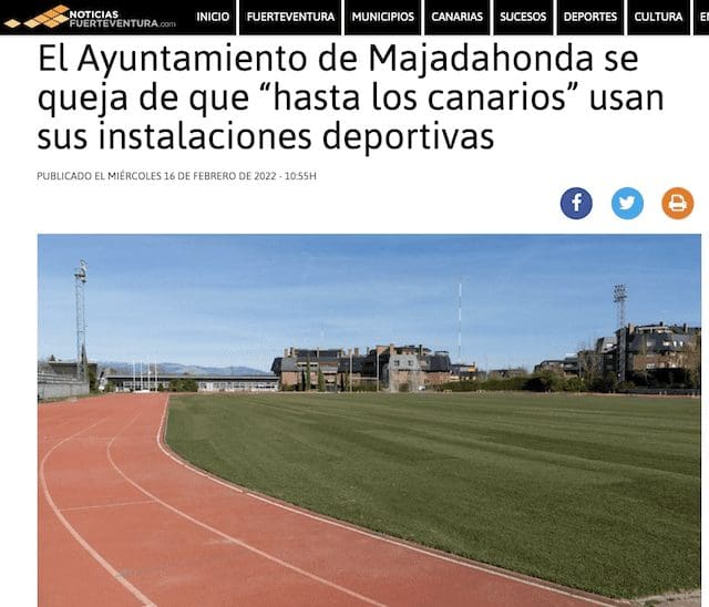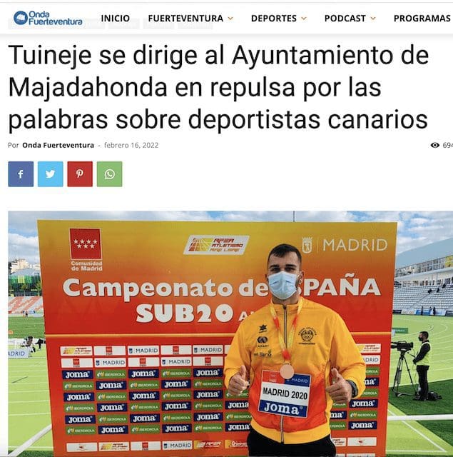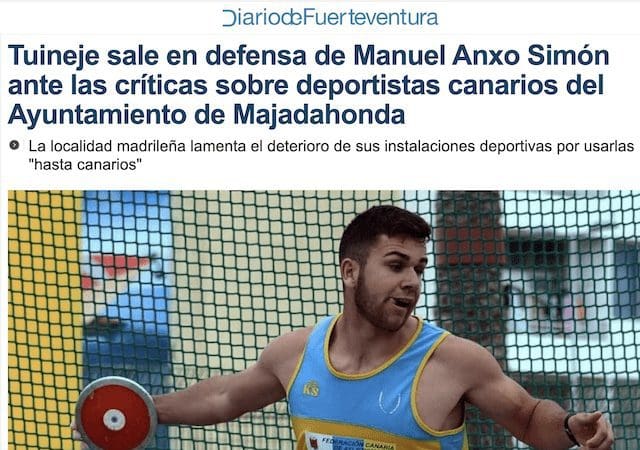 J. FEDERICO MTNEZ. La alcaldesa de Tuineje (Fuerteventura) y ex senadora del Partido Popular (PP), Mª Esther Hernández Marrero, ha enviado al alcalde del Ayuntamiento de Majadahonda una carta de protesta, a la que ha tenido acceso MJD Magazin, en la que traslada «mi repulsa y la del Ayuntamiento que presido a las declaraciones hechas en referencia al uso que hacen deportistas canarios de las instalaciones deportivas que tienen en su municipio». Siguiendo su habitual política de transparencia, la Asociación de Clubes y Deportistas de Majadahonda (ACDM) había distribuido una nota de prensa con el acta de su última reunión con el alcalde y concejal de Deportes. Y en ella se reflejaba un desafortunado comentario del concejal: «el Ayuntamiento afirma que se hace un uso indiscriminado de las instalaciones por deportistas que son ajenos al padrón de Majadahonda, “hasta canarios”, lo que “deteriora un patrimonio de los majariegos”. Con ello respondía a la protesta del Grupo de Lanzadores de Majadahonda, a los que se les prohibe el uso de su material (discos y martillos), que tienen que sustituir por otros de plástico, lo que les obliga a abandonar la instalación. La «metedura de pata» del concejal ha provocado una «tormenta política» en Canarias y el asunto ha adquirido notoriedad nacional en las páginas de Eldiario.es. Proporcionamos las tres versiones sobre esta nueva polémica deportiva: