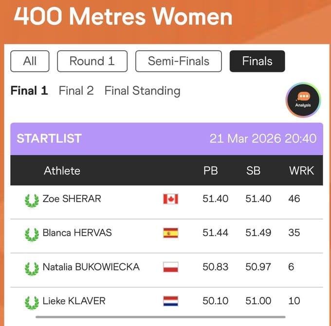 «La madrileña de Majadahonda (23 años), que había ganado su serie eliminatoria en la jornada matinal con 52.15, realizó una fabulosa carrera persiguiendo a la neerlandesa Lieke Klaver, oro continental bajo techo en Apeldoorn 2025».