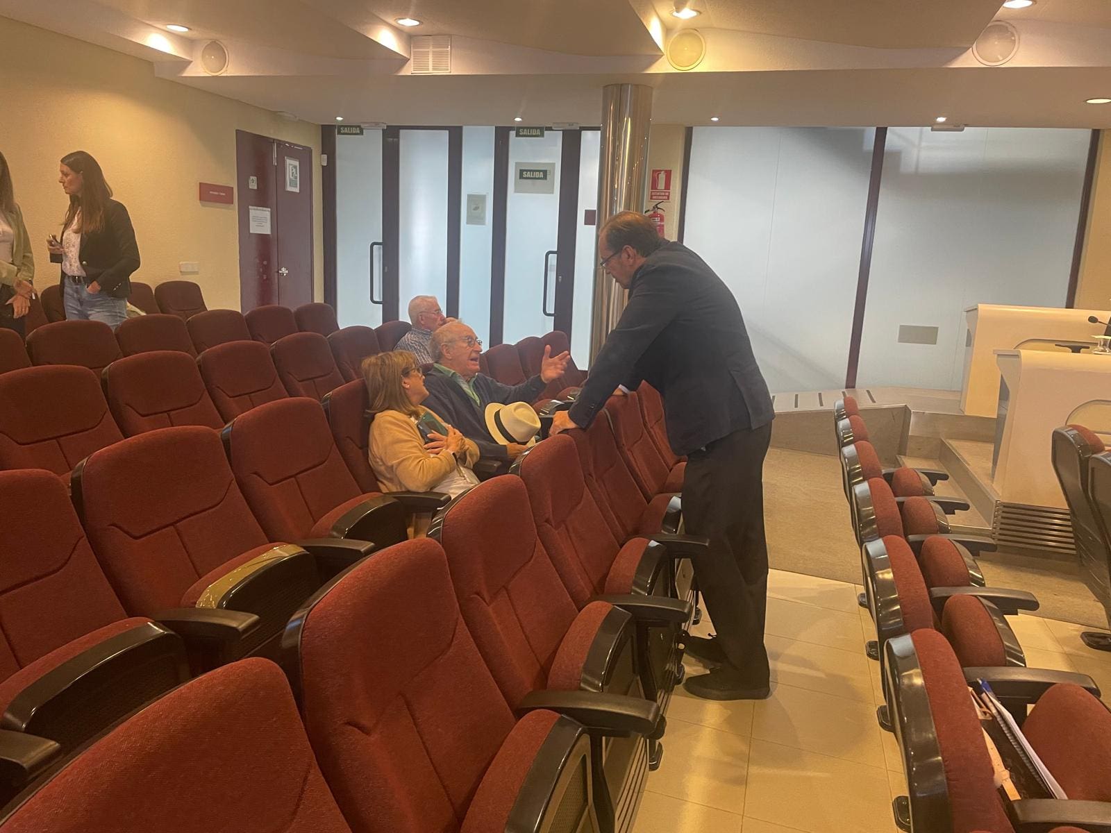 El concejal Federico Martínez (Vecinos por Majadahonda) charla con los miembros de la Plataforma 0,7% al término del pleno