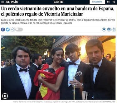 En «El País» leemos también que «Victoria Marichalar no es el primer personaje público que tiene un cerdo vietnamita como mascota. Desde hace ya varios años, este animal se ha puesto muy de moda también entre las celebrities como Elsa Pataky, Miley Cyrus, Ariana Grande e, incluso, la propia Eugenia Martínez de Irujo, quien lamentó la muerte de su animal el año pasado. También George Clooney convivió durante años con un cerdo». Sea lo que fuere, una vez más el nombre de Majadahonda se proyecta mediáticamente. Y esta vez es una flamante bandera y una mascota vietnamita las que tienen la «bendita» culpa de que esta ciudad siga estando de moda para vivir y celebrar cualquier efemérides entre «glamour» y famosos de la alta nobleza española. Y todo ello sin olvidar un detalle solidario: la protagonista no aceptó más regalos y pidió expresamente que se donara el importe de los mismos a una ONG. A la espera de la opinión y criterio de José María Babot Vizcaíno, el experto majariego en la materia, nos atrevemos a decir: ¡ojalá cunda el ejemplo!. De momento, y aguardando el veredicto, les dejamos una batería de titulares sobre el «incidente», que para otros mortales pudiera parecer algo trivial.