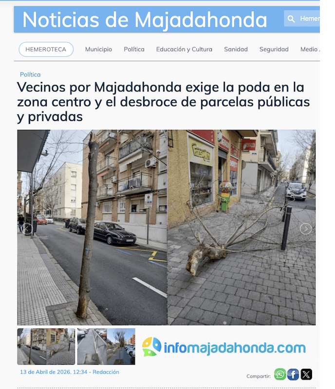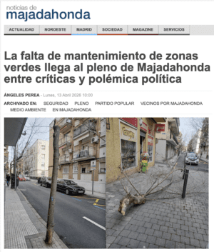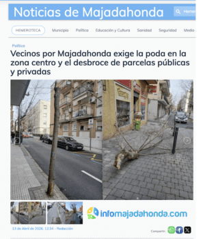 LA PROPUESTA DE «VECINOS POR MAJADAHONDA» QUE EL PP RECHAZA: 1. El Pleno del Ayuntamiento de Majadahonda insta al Equipo de Gobierno a realizar una poda de árboles y arbustos en la zona centro, calle Santa María de la Cabeza y aledañas, afectadas por las denuncias de los vecinos y en las áreas que considere susceptibles de estar incumplimiento el Artículo 56 de la Ordenanza Municipal de Movilidad relativa a los “Obstáculos a la circulación” para, previa notificación a los afectados, proceder en el mes de abril a la poda de los lugares donde se está produciendo esta invasión de la vía pública, con el objetivo de que a partir del 1 de mayo de 2026 ya no existan en la ciudad lugares donde se produzca esta ilegalidad.