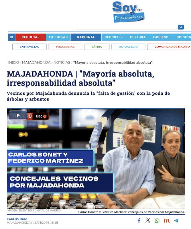 La entrevista del periodista Carlos Ruiz (Televisión Digital de Madrid) a los concejales de «Vecinos por Majadahonda”, Carlos Bonet y Federico Martínez puede consultarse aquí.