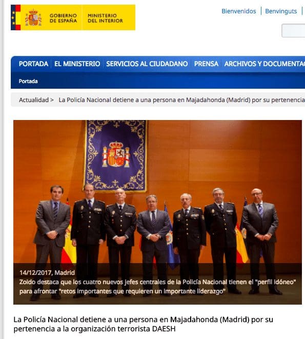 «Desde el 26 de junio de 2015, fecha en el que el Ministerio del Interior elevó a 4 el Nivel de Alerta Antiterrorista (NAA), las Fuerzas y Cuerpos de Seguridad han detenido a 218 terroristas yihadistas en operaciones realizadas en España y en el exterior y a un total de 263 desde principios de 2015. Agentes de la Comisaría General de Información de la Policía Nacional han detenido hoy, en Majadahonda (Madrid), a una persona por su integración en la organización terrorista DAESH. El detenido se encontraba en un estado muy avanzado de captación y había manifestado abiertamente en sus perfiles en redes sociales su vocación de convertirse en mártir y transformarse así en un «instrumento» de guerra del terrorismo yihadista».