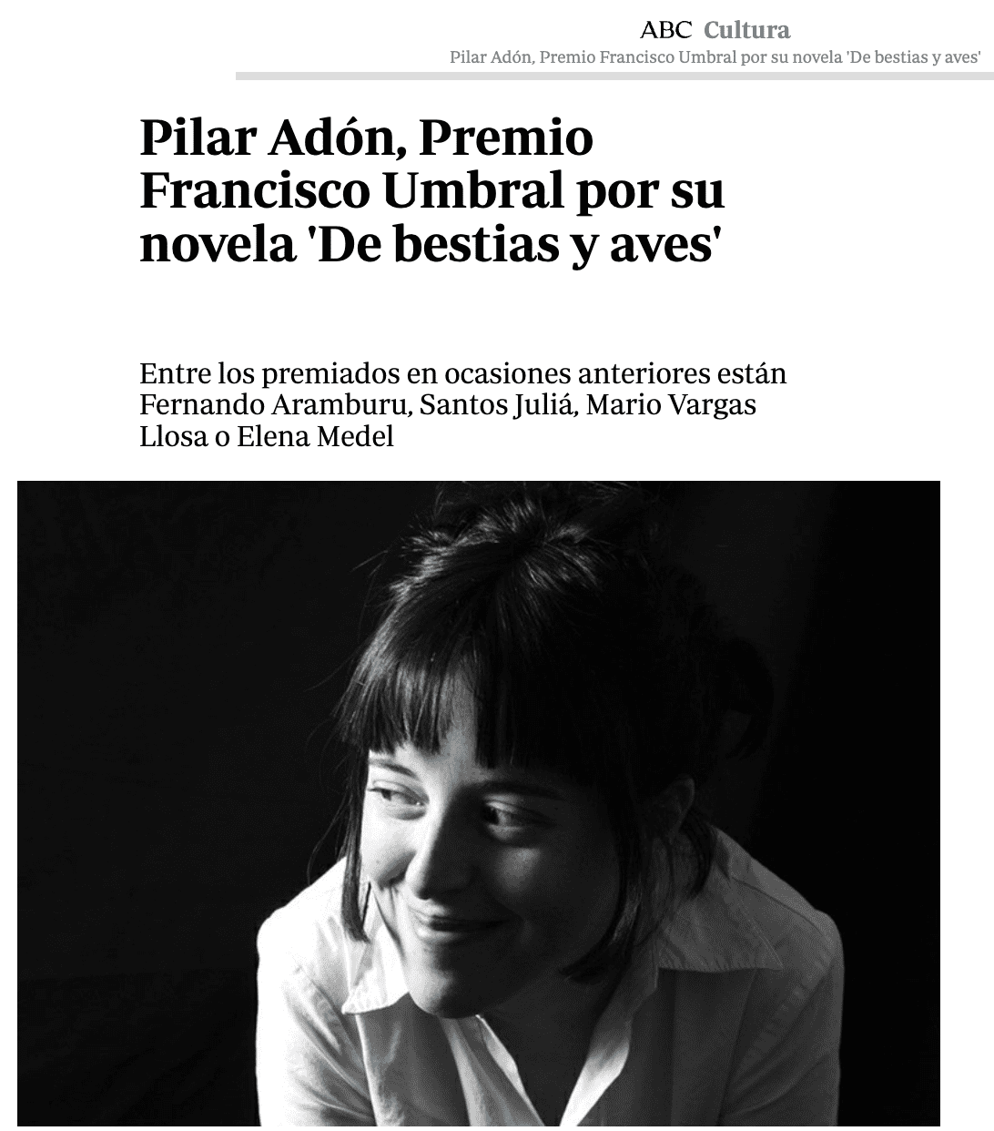 El Norte de Castilla se centra en la viuda del escritor que da nombre al galardón: «María España, presidenta de la Fundación Francisco Umbral, ha comunicado la noticia a la ganadora, Pilar Adón, quien ha declarado: «La ilusión ha sido enorme. Es un premio muy especial para mí, por lo que significa como galardón, por el nombre que lleva y por la nómina de ganadores de años previos que son referentes de las letras españolas». Sobre el propio Francisco Umbral añade: «Francisco Umbral siempre fue un referente para mí, como lo fue para buena parte de los escritores y lectores de mi generación. Su posicionamiento estético, su honradez literaria, su coherencia, su humor, su militancia como escritor pleno, su apuesta por el lenguaje desnudo y, a la vez, su tremenda capacidad lírica para describir el amor, el dolor y la época que le tocó vivir»». Otros medios, sin embargo, sí se acuerdan de quienes patrocinan este galardón, como ABC: «El premio está dotado con 12.000 euros (cantidad con la que el Ayuntamiento de Majadahonda contribuye como patrono a la Fundación Francisco Umbral), y una escultura diseñada por Alberto Corazón. Se reconoce el mejor libro de los escritos en castellano editado entre el 1 de enero y el 31 de diciembre de 2022. El jurado ha decidido otorgar el premio a Pilar Adón por su novela ‘De bestias y aves’: «Esta es una novela enigmática con un estilo propio que combina la imaginación, el misterio y la poesía».