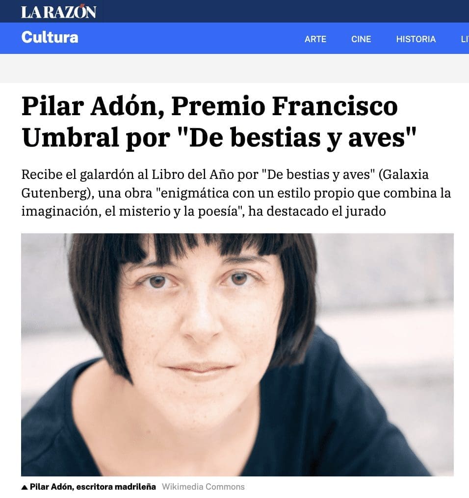 LIDIA GARCIA. «Pilar Adón responde al teléfono apenas 10 minutos después de conocer el fallo, todavía «muy impresionada» y con una «emoción inmensa» por el reconocimiento de un jurado formado por «grandes escritores y lectores a los que admiro y respeto». De bestias y aves, cuarta novela de Adón, es la historia de una mujer herida por la pérdida de su hermana en un accidente de automóvil al que ella misma sobrevivió. Decide huir, y acaba accidentalmente en Betania, una suerte de comunidad utópica formada exclusivamente por mujeres que practican un culto ancestral, aisladas del resto del mundo y rodeadas de un paisaje característico dominado por la vegetación, una roca que oculta el sol y un lago que delimita el espacio de convivencia, cuenta el periodista Borja Martínez de El Mundo. Es uno de los periódicos que no mencionan a la ciudad de Majadahonda, que es la que sufraga este premio literario hecho público este martes 24 de enero (2023): «El Premio Francisco Umbral al Libro del Año es una iniciativa de la Fundación Francisco Umbral que se ha consolidado como uno de los galardones más reputados de nuestro país».