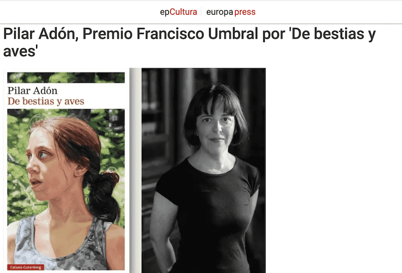 Tampoco menciona a Majadahonda el diario La Voz de Galicia: «La escritora Pilar Adón (Madrid, 1971) ha ganado el Premio Francisco Umbral al Libro del Año por su obra De bestias y aves, de la editorial Galaxia Gutenberg. Tal y como informa Efe, el premio, dotado con 12.000 euros, es otorgado por la Fundación Francisco Umbral para fomentar la lectura y la cultura y reconoce en esta edición al mejor libro de los escritos en castellano y editados entre el 1 de enero y el 31 de diciembre de 2022. Entre los premiados en ocasiones anteriores están los libros Patria, de Fernando Aramburu (2016); Transición, de Santos Juliá (2017); Sur, de Antonio Soler (2018); Tiempos recios, de Mario Vargas Llosa (2019) y Las maravillas, de Elena Medel (2020); y Morderse la lengua de Darío Villanueva (2021)».