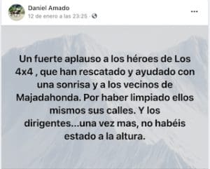 En tercer lugar Daniel Amado (54 comentarios) con su comentario: «Un fuerte aplauso a los héroes de los 4×4, que han rescatado y ayudado con una sonrisa a los vecinos de Majadahonda. Por haber limpiado ellos mismos sus calles. Y los dirigentes… una vez más, no habéis estado a la altura». Y en cuarto lugar de este honorífico podium social Jose Monjas Recalde (43 comentarios) con «Vergüenza me da vivir en este pueblo, ¿yo no pago impuestos como los demás?». Todos ellos suscitaron un interesante debate público y demostraron con su cívica actitud que el control sobre la gestión de los caudales comunes municipales es cosa de todos.