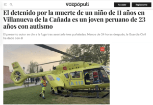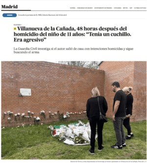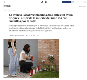 A3 TV (Sara Sanz Navarro): DAVID LE ABRÍA LAS PUERTAS A TODO EL MUNDO». Un joven de 23 años ha asesinado presuntamente a David, un menor de 11 años en Villanueva de la Cañada (Madrid). El presunto autor del crimen tiene un trastorno del espectro autista severo, conocía a la víctima y ya habría intimidado a David en otras ocasiones. Quique Fanjul, un vecino de Villanueva de la Cañada que además es entrenador de David, acompañó a los padres al hospital. «Fue horroroso», asegura. Según nos cuenta, el menor era muy buen amigo y compañero, tanto que, cuando algunos niños daban de lado al presunto agresor, este le acogió. «David le abría las puertas a todo el mundo», afirma Quique. «SI NO ME CONCEDES EL AMOR, VOY A DESATAR LA IRA». El asesino del niño de Villanueva de la Cañada: «No quiero ser una carga, no quiero hacer daño a mis amigos». La Guardia Civil recoge las notas que el homicida enviaba a los amigos de la víctima. «Si no me concedes el amor, voy a desatar la ira». El homicida está ingresado en el Hospital de Móstoles como detenido. La Guardia CIvil busca el arma del crimen. El asesino del niño de 12 años de Villanueva de la Cañada (Madrid) era consciente de su enfermedad psiquiátrica y sufría por ello. La Guardia Civil ha recogido las notas y mensajes que Julio, de 23 años, enviaba a la víctima y a sus amigos. «No quiero ser una carga, no quiero hacer daño a mis amigos», dice en algunas, mientras en otras expresa su sentir ante el rechazo de los menores: «Si no me concedes el amor, voy a desatar la ira». Los investigadores interpretan los mensajes en el contexto del caso, cuya hipótesis principal es que el asesino tenía una obsesión que rayaba lo sexual con la víctima a la que terminó apuñalando en los servicios del centro cultural de la localidad madrileña. Fuentes del caso confirman que tanto por el comportamiento previo del homicida peruano, como por las declaraciones de su entorno, ««Era evidente que sufre un trastorno psiquiátrico y la familia así lo confirma, sin dar más detalles de momento».
