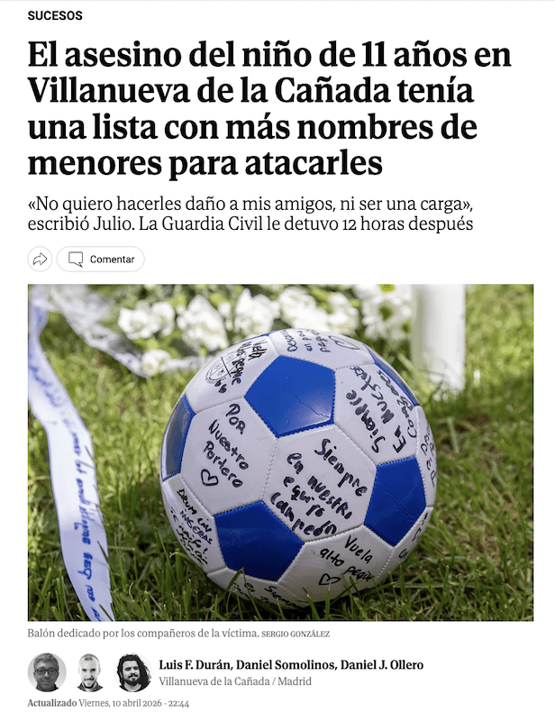 A3 TV (Sara Sanz Navarro): DAVID LE ABRÍA LAS PUERTAS A TODO EL MUNDO». Un joven de 23 años ha asesinado presuntamente a David, un menor de 11 años en Villanueva de la Cañada (Madrid). El presunto autor del crimen tiene un trastorno del espectro autista severo, conocía a la víctima y ya habría intimidado a David en otras ocasiones. Quique Fanjul, un vecino de Villanueva de la Cañada que además es entrenador de David, acompañó a los padres al hospital. «Fue horroroso», asegura. Según nos cuenta, el menor era muy buen amigo y compañero, tanto que, cuando algunos niños daban de lado al presunto agresor, este le acogió. «David le abría las puertas a todo el mundo», afirma Quique. «SI NO ME CONCEDES EL AMOR, VOY A DESATAR LA IRA». El asesino del niño de Villanueva de la Cañada: «No quiero ser una carga, no quiero hacer daño a mis amigos». La Guardia Civil recoge las notas que el homicida enviaba a los amigos de la víctima. «Si no me concedes el amor, voy a desatar la ira». El homicida está ingresado en el Hospital de Móstoles como detenido. La Guardia CIvil busca el arma del crimen. El asesino del niño de 12 años de Villanueva de la Cañada (Madrid) era consciente de su enfermedad psiquiátrica y sufría por ello. La Guardia Civil ha recogido las notas y mensajes que Julio, de 23 años, enviaba a la víctima y a sus amigos. «No quiero ser una carga, no quiero hacer daño a mis amigos», dice en algunas, mientras en otras expresa su sentir ante el rechazo de los menores: «Si no me concedes el amor, voy a desatar la ira». Los investigadores interpretan los mensajes en el contexto del caso, cuya hipótesis principal es que el asesino tenía una obsesión que rayaba lo sexual con la víctima a la que terminó apuñalando en los servicios del centro cultural de la localidad madrileña. Fuentes del caso confirman que tanto por el comportamiento previo del homicida peruano, como por las declaraciones de su entorno, ««Era evidente que sufre un trastorno psiquiátrico y la familia así lo confirma, sin dar más detalles de momento».