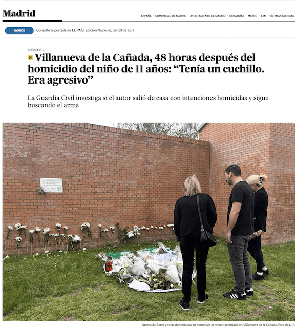 AGENCIA EFE. (Villanueva de la Cañada, 13 abril de 2026). Una jueza de Móstoles (Madrid) ha decretado prisión preventiva para el joven Julio B. de 23 años, discapacitado en un 70% por un grado 3 severo de autismo y según sus parientes, se comportaba como si tuviera 10 años. El homicida fue detenido como presunto autor del apuñalamiento de David de 12 años en Villanueva de la Cañada, que falleció después a causa de las numerosas heridas. Fuentes de la investigación han informado a EFE de que el arrestado ha pasado este domingo a disposición del juzgado de guardia de Móstoles, que ha decretado su ingreso en prisión provisional en la cárcel de Navalcarnero. El joven no ha querido prestar declaración ante la magistrada. El alcalde de Villanueva de la Cañada, Luis Manuel Partida (PP), encabezó la mañana del viernes en la Plaza de España de la localidad un minuto de silencio para mostrar la consternación por un inexplicable crimen. «La mente humana es como es, y quien padece problemas, pues a veces son incontrolables y, en este caso, es lo que ha pasado», dijo a los periodistas sobre la mortal agresión el regidor, quien estuvo acompañado por su homóloga de Brunete, municipio donde residía el niño.