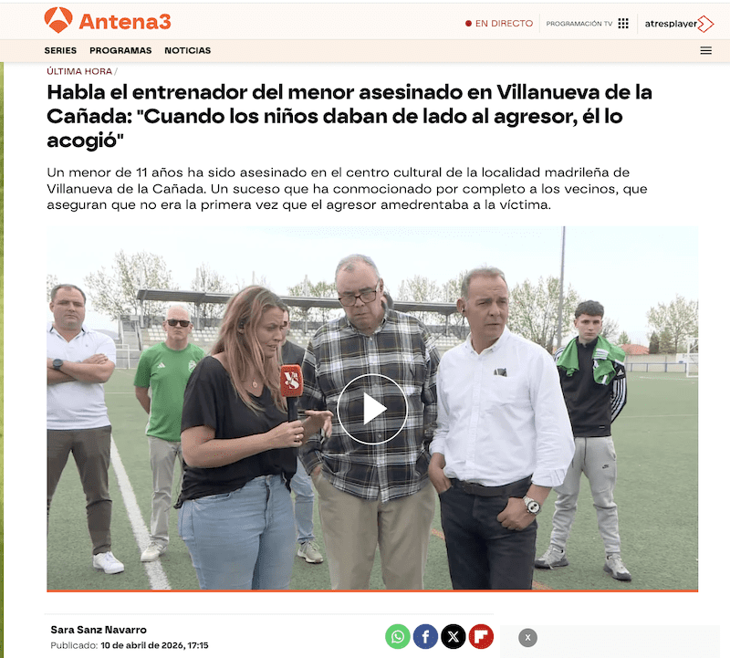 Antena 3 TV: «Quique Fanjul, un vecino de Villanueva de la Cañada que además es entrenador de David, cuenta que el menor era muy buen amigo y compañero, tanto que, cuando algunos niños daban de lado al presunto agresor, este le acogió. «David le abría las puertas a todo el mundo»