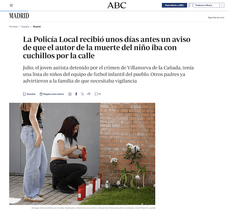 ABC (Carlos Hidalgo). LA POLICÍA LOCAL RECIBIÓ UNOS DÍAS ANTES UN AVISO DE QUE EL AUTOR DE LA MUERTE DEL NIÑO IBA CON CUCHILLOS POR LA CALLE. Julio, el joven detenido por el crimen; un guardia civil rastrea con un perro en busca de vestigios; amigos de la familia de David, en una concentración de repulsa. (José Ramón Ladra/ABC). Julio, el joven autista detenido por el crimen de Villanueva de la Cañada, tenía una lista de niños del equipo de futbol infantil del pueblo. Otros padres ya advirtieron a la familia de que necesitaba vigilancia. Amigas de la víctima, en el altar dedicado a David en el centro cultural de Villanueva de la Cañada. (José Ramón Ladra). El niño asesinado en Villanueva: «Julio quiere que sea su novio: ha pintado nuestras iniciales en el ayuntamiento». Los padres de otros niños ya llevaban tiempo advirtiendo a la familia de Julio, el joven autista de 23 años detenido por matar este jueves a un niño de 12 en Villanueva de la Cañada, de que debían «vigilarlo más», puesto que estaban preocupados por su actitud hacia sus hijos, menores de edad. Además, según relatan a ABC fuentes de la investigación, alrededor de 10 días antes del homicidio, la propia Policía Local del pueblo recibió un aviso ciudadano en el que alertaban de la presencia del ahora arrestado con un arma blanca en la calle. Los agentes acudieron al comunicado, pero cuando llegaron no estaban ya ni Julio ni ningún rastro de cuchillos o similares. Al cierre de esta edición, la Guardia Civil tampoco había encontrado el objeto punzante con el que el sospechoso presuntamente cosió a David, el menor asesinado, en el centro cultural La Despernada, junto a la biblioteca Fernando Lázaro Carreter y el parque de la Estrella. «Hallar el arma es fundamental en este caso, puesto que la estrategia aparente del veinteañero es afirmar que ha sufrido un brote psicótico. Es más, ni él ni su familia están colaborando en las pesquisas del caso. Más bien, intentan hacer entender que sus problemas mentales son más graves, por encima del autismo en grado 3, con una discapacidad del 71%, que la madre asegura que padece Julio», añaden nuestros informantes.