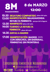Por su parte, la crónica de Julia Bachiller de este controvertido 8 de marzo de 2020 recuerda como las feministas no se habían unido a los actos institucionales del Ayuntamiento de Majadahonda, que habia organizado los suyos por su cuenta y riesgo: «Por tercer año consecutivo, la Coordinadora Feminista de Majadahonda organiza una manifestación por el Día Internacional de las Mujeres Trabajadoras. La manifestación, que el año pasado albergó a más de 100 personas, partirá este domingo 8 de marzo (2020) desde el Parque de la Laguna. Antes, desde las 10:30 horas, la Coordinadora Feminista de Majadahonda estará en la Plaza del Ayuntamiento celebrando un desayuno popular para coger fuerzas ante esta jornada de reivindicación. Tras la marcha, se procederá a la lectura del Manifiesto en la Plaza del Ayuntamiento, donde se exigirán todas las demandas del 8-M Majadahonda dentro de los cuatro ejes de lucha: cuerpos, fronteras, violencias y economía. La jornada finalizará en el pueblo con una acción-performance llamada «Tejiendo la Revuelta Feminista», señalaba la crónica.