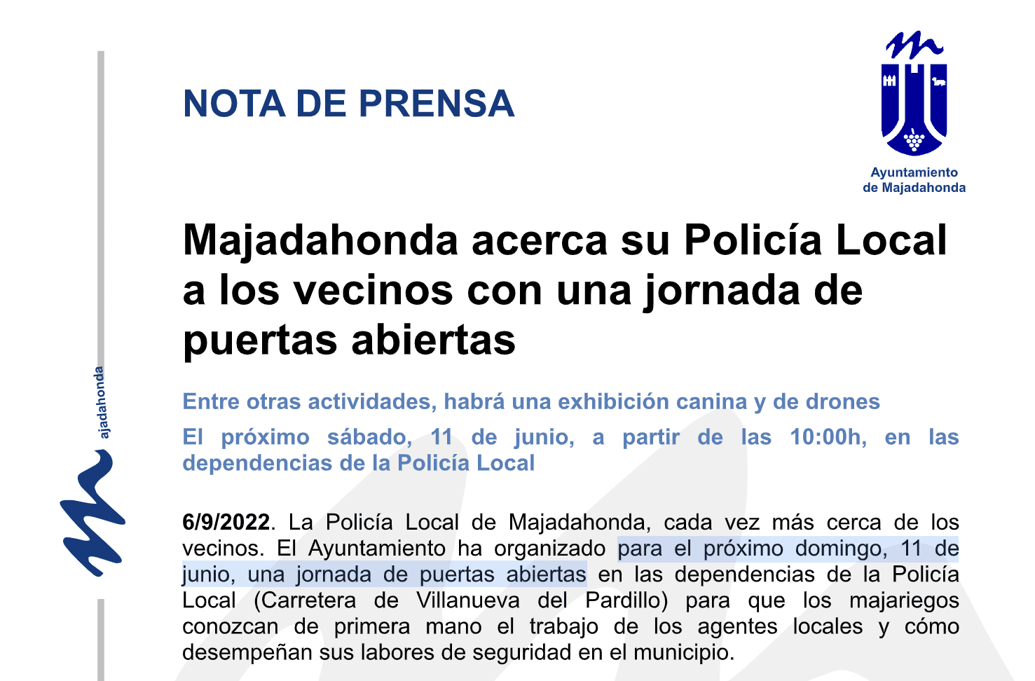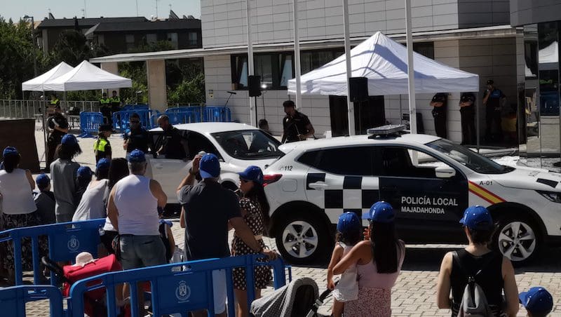 JULIA BACHILLER. Como ya adelantó este periódico (la nota de prensa del Ayuntamiento contenía una errata que citaba a los vecinos el domingo), la Policía Local de Majadahonda abrió este sábado 11 de junio (2022) sus puertas a vecinos y visitantes, en un gesto de acercamiento a la ciudadanía. Las elevadas temperaturas a primera hora de la mañana no fueron impedimento para que un numeroso público, en su mayoría de corta edad, aceptase esta grata invitación por parte de los responsables de la seguridad ciudadana de Majadahonda. Tanto en el recinto exterior como en el interior del edificio principal, los asistentes pudieron disfrutar de diversas actividades, todas ellas dirigidas a ampliar los conocimientos en educación y seguridad vial. Además, mostraron el material del cual disponen estos agentes en su labor diaria, junto con las novedades incorporadas recientemente, como son las bicicletas y los drones. Para finalizar, se realizó la esperada demostración de la Unidad Canina, que en esta ocasión contó con la participación del Ejército, Policía Nacional y Policía Local de Majadahonda y de los municipios de Villanueva de la Cañada, Torrejón de Ardoz, San Sebastián de los Reyes, San Lorenzo del Escorial, Pedrezuela, y Leganés. No hay que olvidar a los miembros de Protección Civil, que también tuvieron su lugar y misión en estas instalaciones, mostrando a los asistentes su principal herramienta de trabajo: su ambulancia para acudir a donde se requiera su presencia.