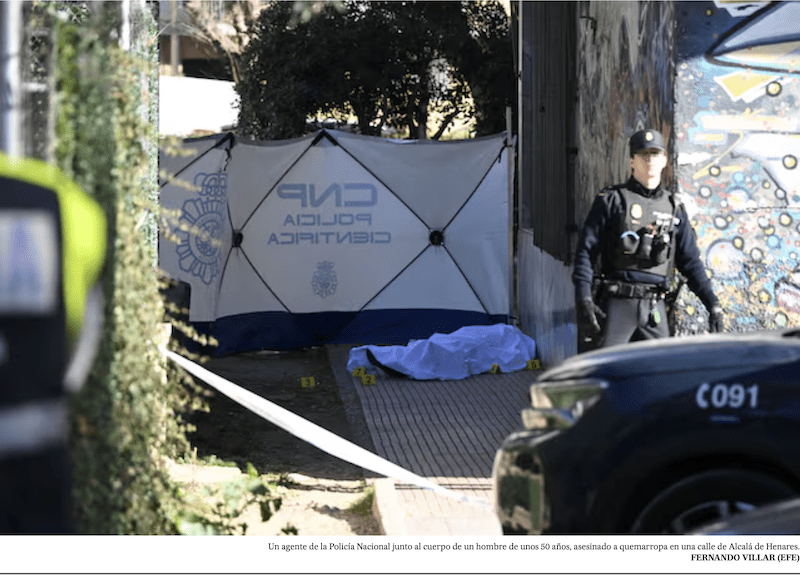 MANU RAMOS. Un asesino profesional que vivía en Majadahonda, tenía «fama de tranquilo» y escondía una frialdad y fiereza digna de una película de miedo, ha sido detenido por la Policía Nacional tras cobrar 20.000 euros por matar a un feriante de 49 años que vivía en Alcalá de Henares y era padre de 4 hijos. Las causas del asesinato se desconocen, así como el origen del «encargo», pero la policía tiene pistas muy sólidas sobre ello: el tipo formaba parte de una banda compuesta por 3 colombianos y 1 español que fueron contratados para que liquidasen a Jesús B. J., en la calle de Los Hueros, en el barrio del Chorrillo de Alcalá de Henares. Lo hizo el 13 de enero de este mismo año 2025 a las 8:30 de la mañana cuando lo esperaban a la puerta de su casa tras haber aparcado su furgoneta. Los 6 disparos fueron realizados con silenciador, el primero con orificio en el cuello por arma de fuego, que le supuso la muerte en el acto, y después fue rematado con otros 5 disparos en la cabeza, cuerpo y torax para que no quedaran dudas de su muerte. Siguiendo el rastro de la pistola y del coche en el que huyeron, que fue sustraído en Madrid en julio de 2024 y circulaba con placas falsas, agentes del Grupo V de Homicidios identificaron a 4 hombres, entre ellos 2 delincuentes profesionales, que habían sido contratados para cometer el asesinato en sus diferentes funciones de vigilancia primero, autoría material después y finalmente cobertura para su huida. El coche donde huyeron los sicarios fue localizado a finales de febrero en un pueblo de Guadalajara y en su maletero se localizó el arma homicida con su correspondiente silenciador, informa el Cuerpo Nacional de Policía en una nota de prensa. Un vídeo desde el lugar donde se cometió el crimen revela datos sobre la crueldad de su autor.