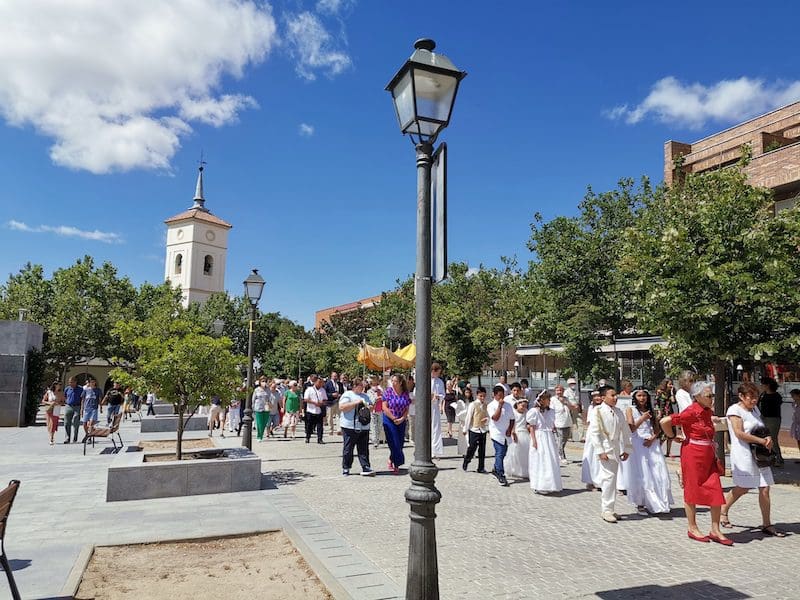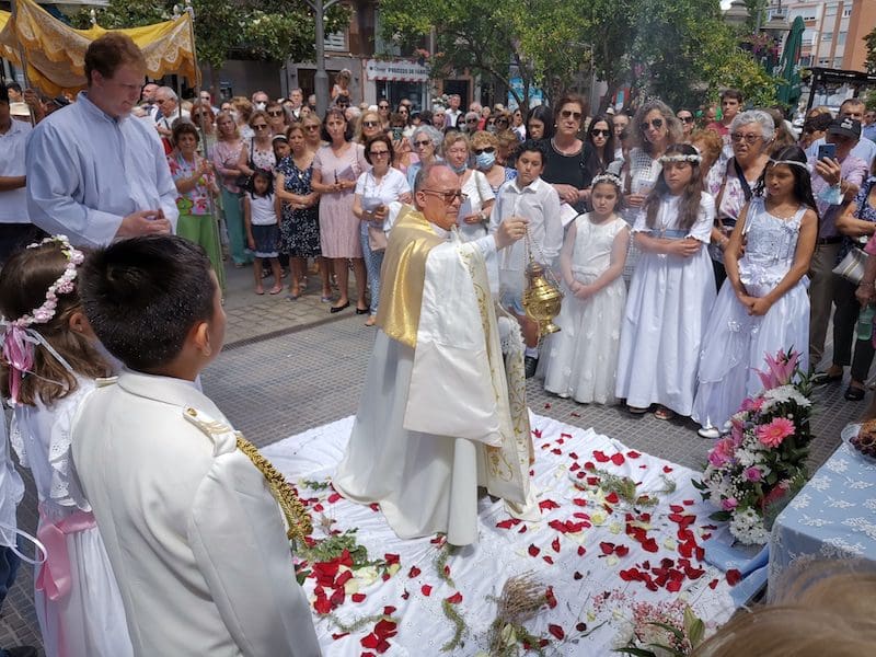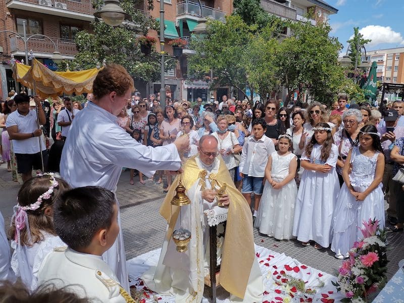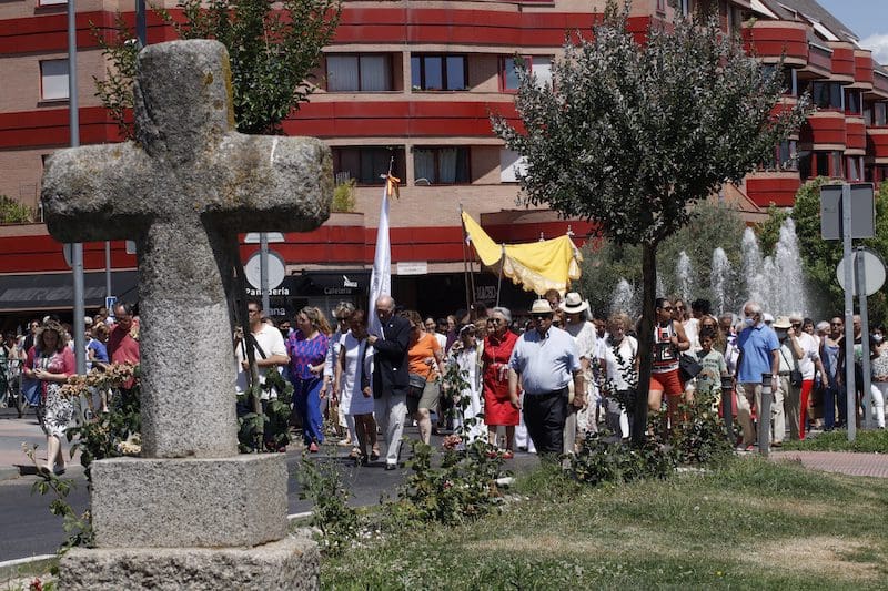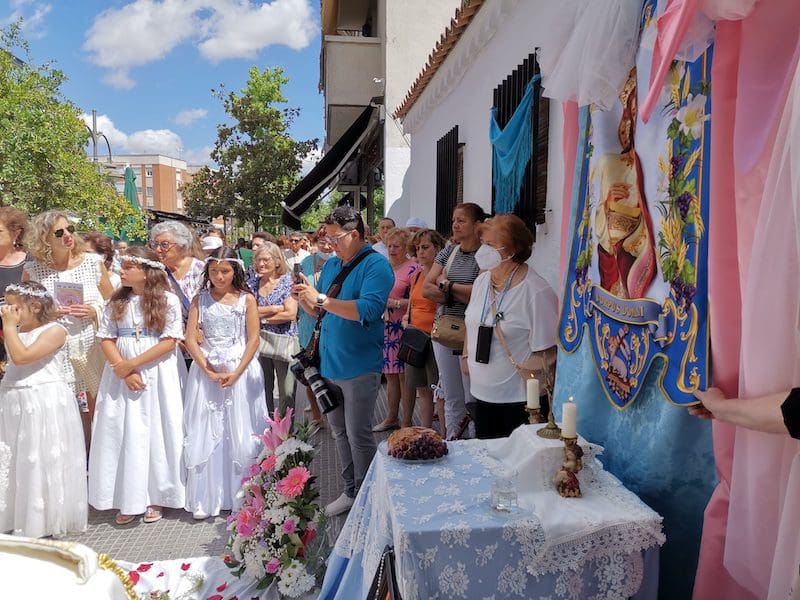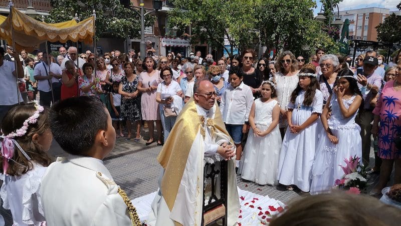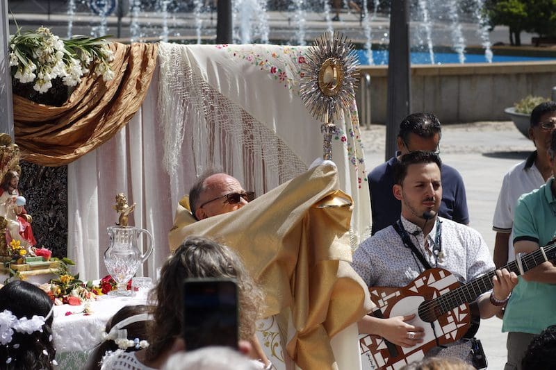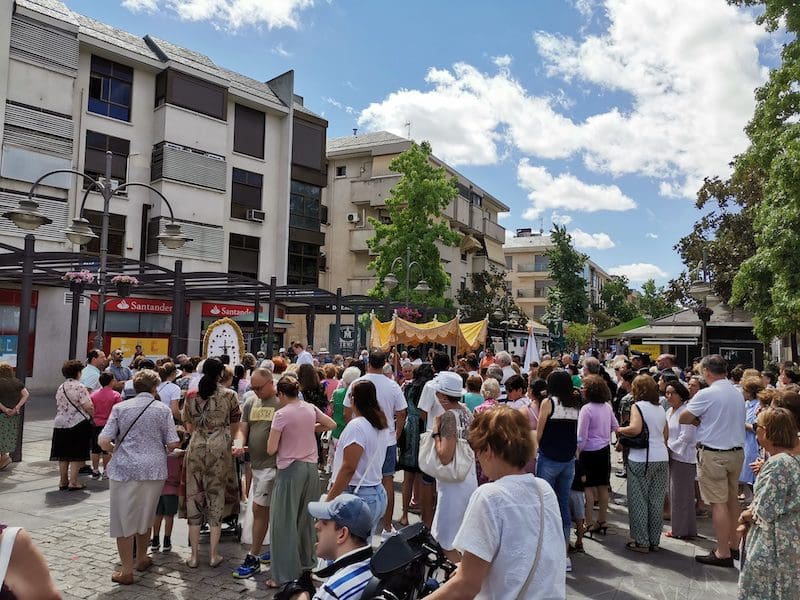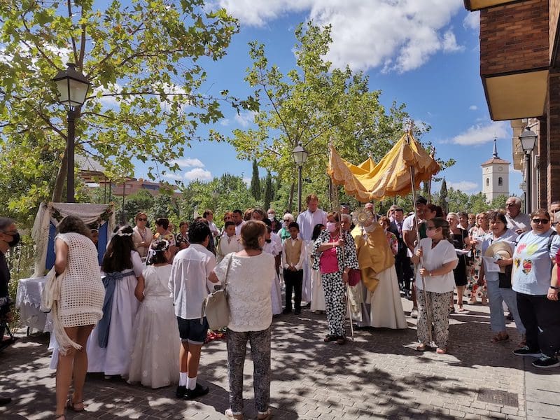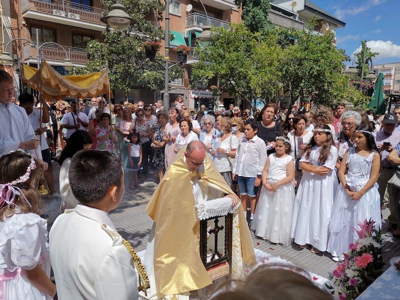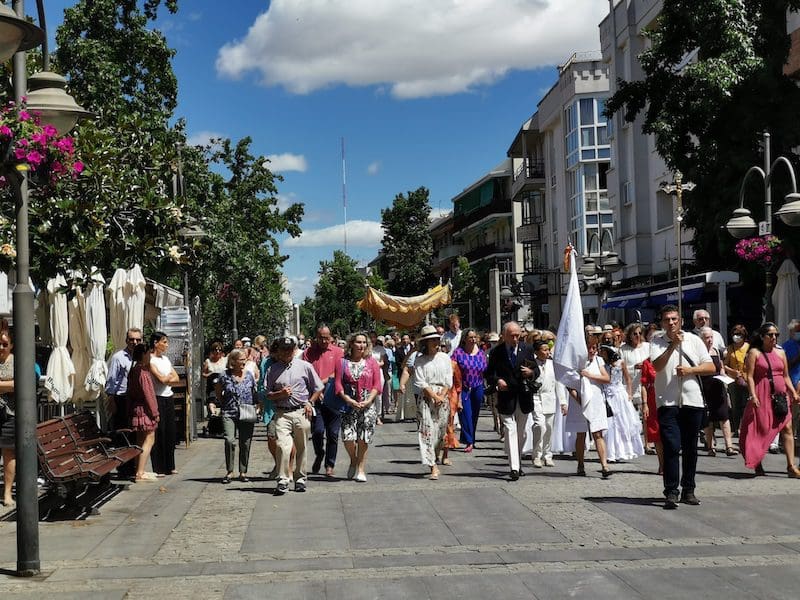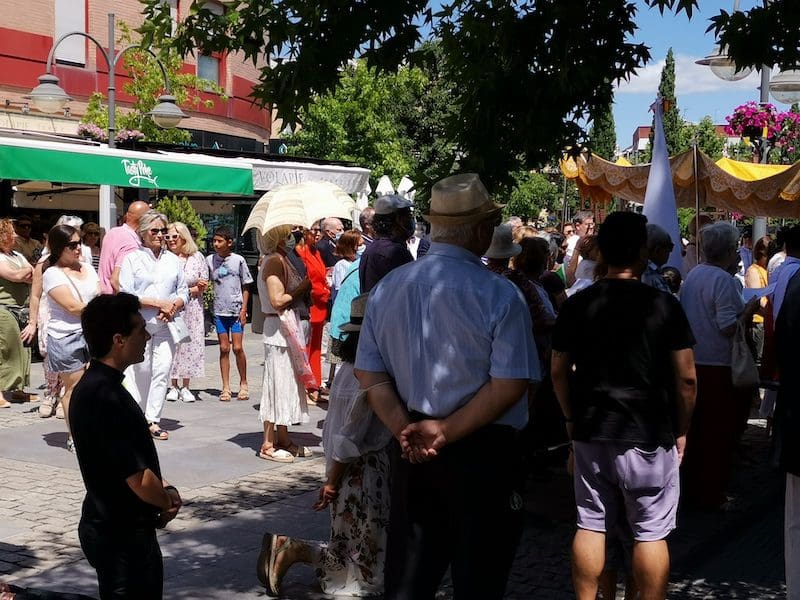 JULIA BACHILLER. Tras dos años de pandemia, Majadahonda volvió a celebrar en sus calles este domingo 19 de junio (2022) la tradicional procesión del Corpus Christi, que como apunta en un comunicado Arciprensa “es la procesión del Cuerpo y Sangre de Cristo que se realiza después de la Misa principal del día, la más importante de todas las procesiones”. La gran acogida por parte de los vecinos en esta ocasión fue notable en todo momento: a las 11:00 horas daba comienzo la Misa, para posteriormente comenzar la procesión. La representación religiosa y espiritual transcurrió por la Plaza de la Constitución hasta la calle Mieses, desde donde enlazó con la Gran Vía hasta llegar a la ermita. Esta procesión se caracteriza porque en su recorrido realiza diversas paradas en los altares organizados por familias y vecinos, los cuales están adornados con variados motivos, comidas, flores, figuras, estandartes, etc., como símbolo de ofrenda y devoción. Un total de 6 altares han sido montados en esta ocasión y el párroco Juan Francisco Pérez Ruano ha ido depositando la custodia que bajo palio portaba entre sus manos. Estas iban cubiertas por el “Humeral”, que es «un paño de aproximadamente 2 metros de largo por 50 cm de ancho que el sacerdote usa sobre los hombros y espalda para portar el Santísimo Sacramento al bendecir con Él, o para llevarlo en procesión. Suele ser blanco o dorado”, según su definición.