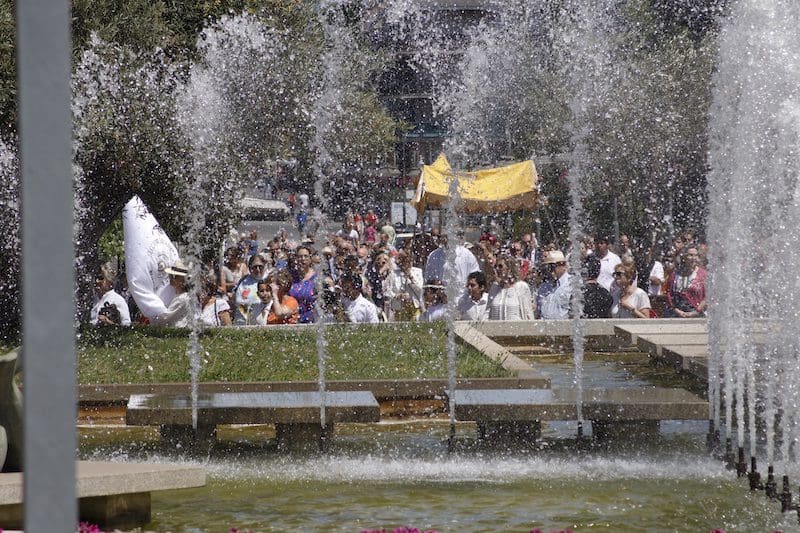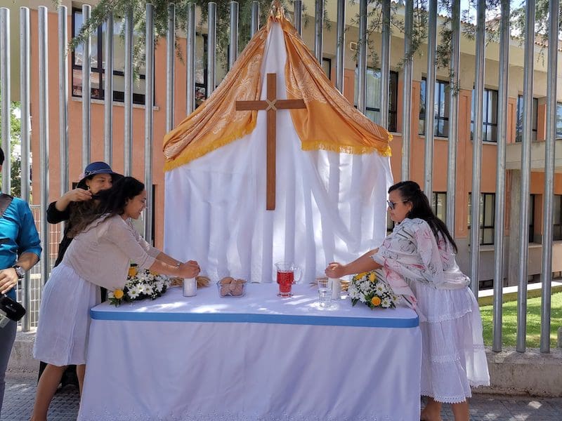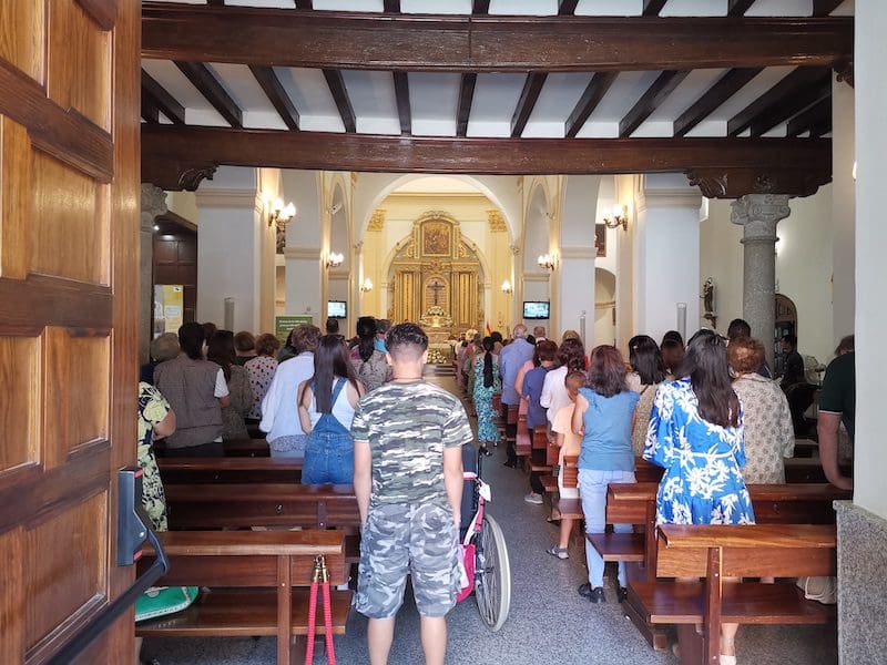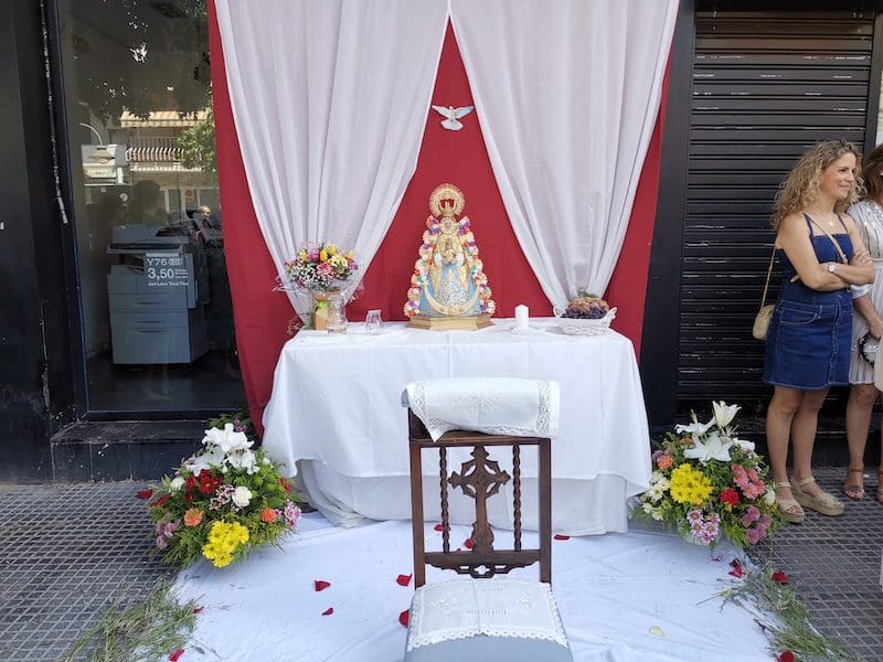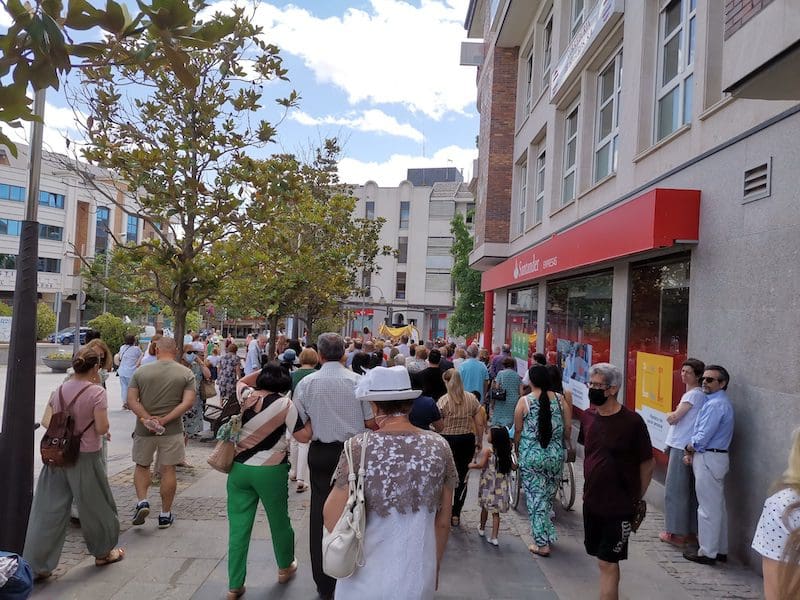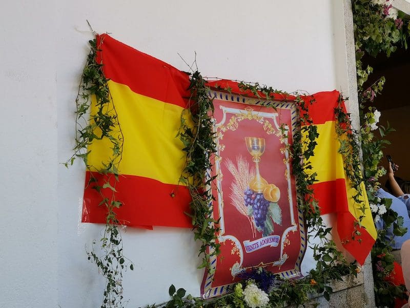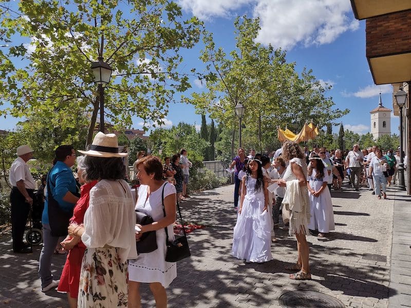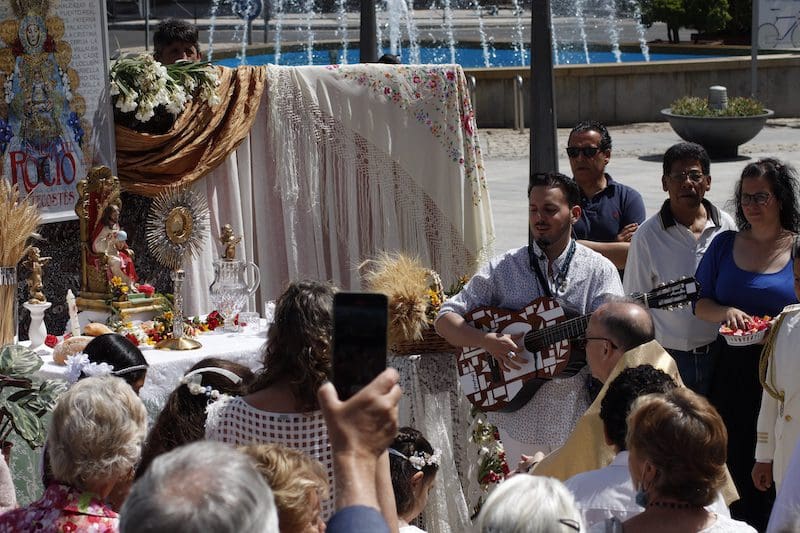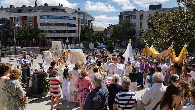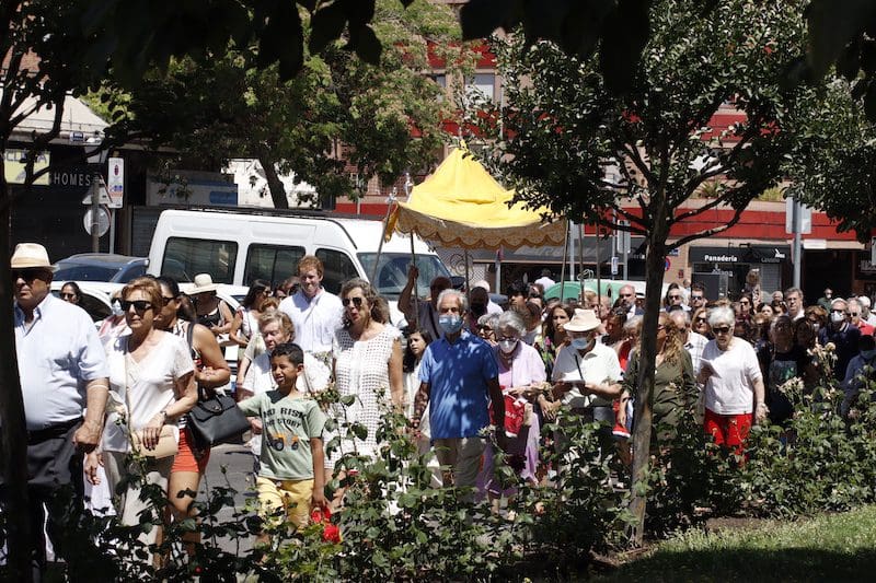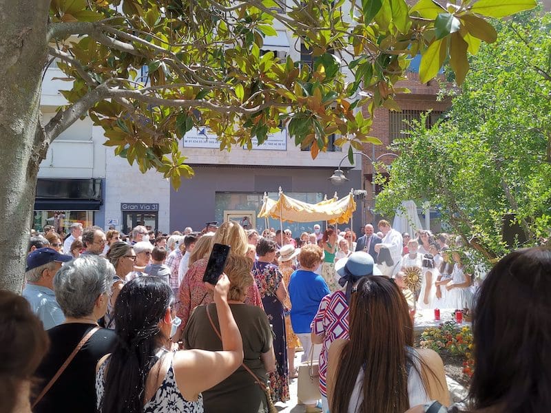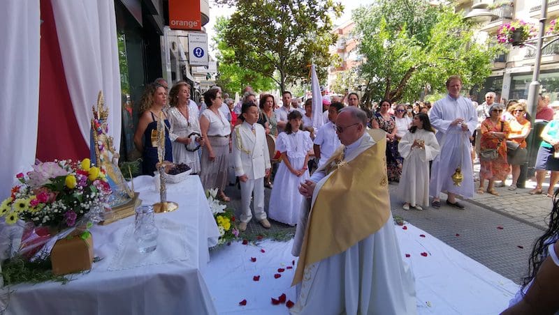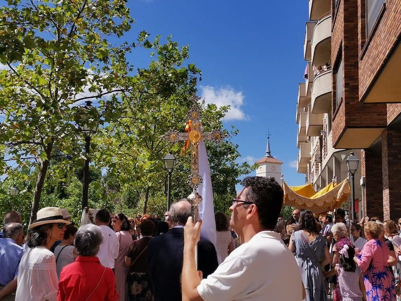 JULIA BACHILLER. Tras dos años de pandemia, Majadahonda volvió a celebrar en sus calles este domingo 19 de junio (2022) la tradicional procesión del Corpus Christi, que como apunta en un comunicado Arciprensa “es la procesión del Cuerpo y Sangre de Cristo que se realiza después de la Misa principal del día, la más importante de todas las procesiones”. La gran acogida por parte de los vecinos en esta ocasión fue notable en todo momento: a las 11:00 horas daba comienzo la Misa, para posteriormente comenzar la procesión. La representación religiosa y espiritual transcurrió por la Plaza de la Constitución hasta la calle Mieses, desde donde enlazó con la Gran Vía hasta llegar a la ermita. Esta procesión se caracteriza porque en su recorrido realiza diversas paradas en los altares organizados por familias y vecinos, los cuales están adornados con variados motivos, comidas, flores, figuras, estandartes, etc., como símbolo de ofrenda y devoción. Un total de 6 altares han sido montados en esta ocasión y el párroco Juan Francisco Pérez Ruano ha ido depositando la custodia que bajo palio portaba entre sus manos. Estas iban cubiertas por el “Humeral”, que es «un paño de aproximadamente 2 metros de largo por 50 cm de ancho que el sacerdote usa sobre los hombros y espalda para portar el Santísimo Sacramento al bendecir con Él, o para llevarlo en procesión. Suele ser blanco o dorado”, según su definición.