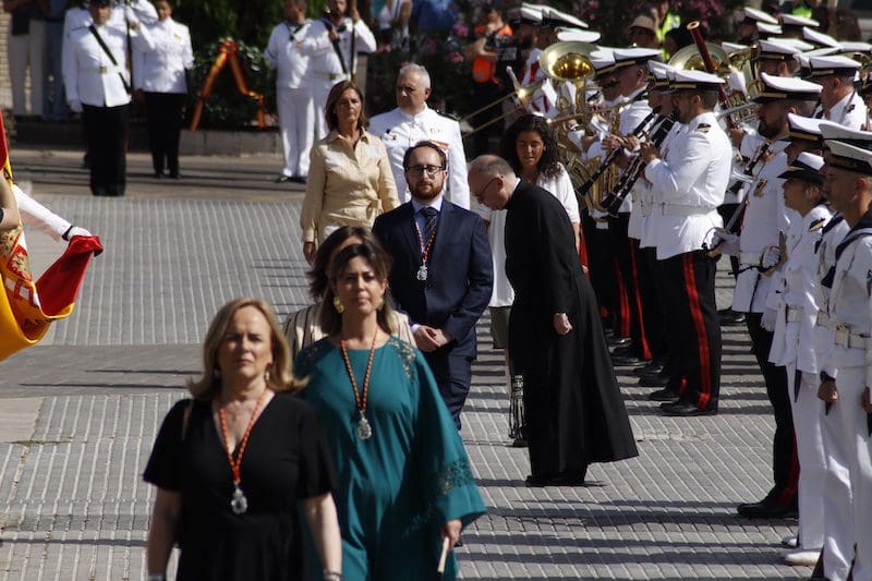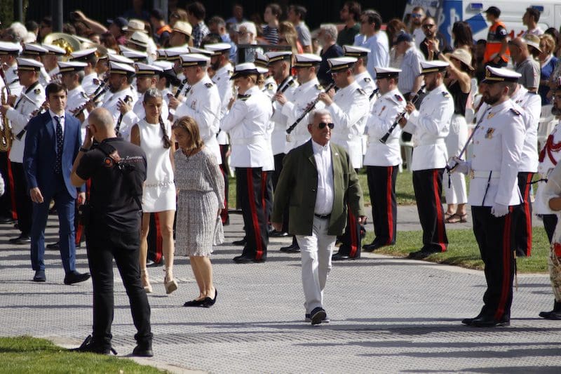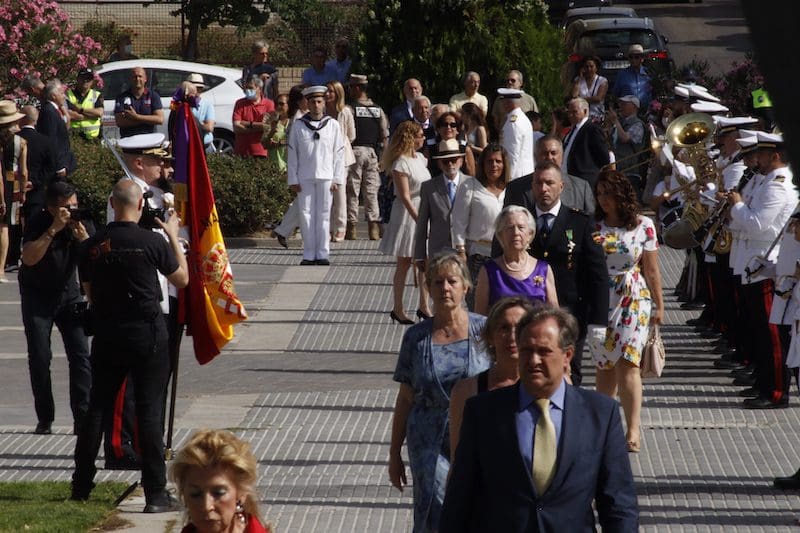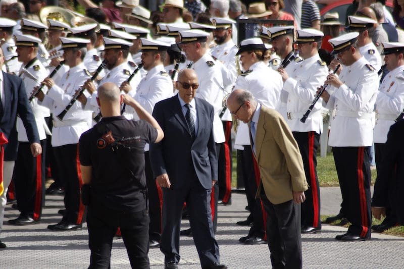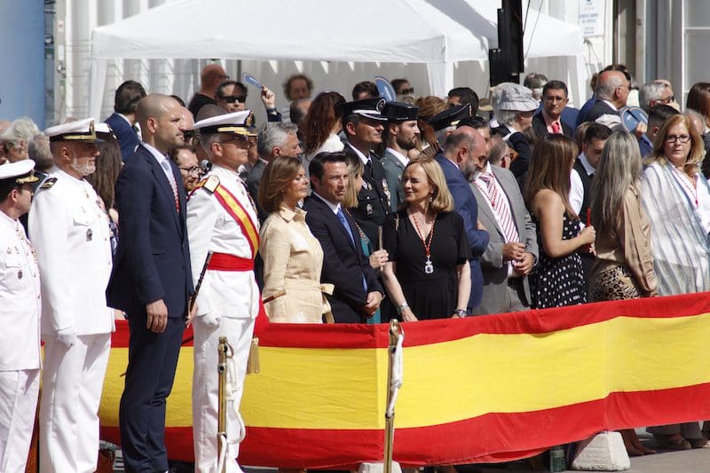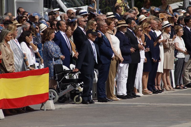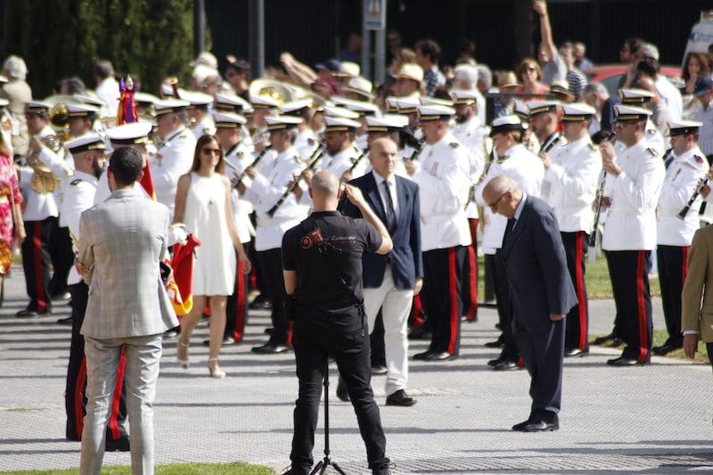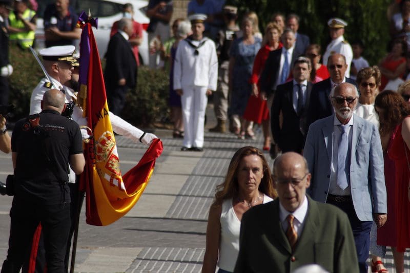 En el ámbito político destacó la presencia de concejales del PP junto con Paloma Adrados (PP), senadora y diputada regional de la Asamblea de Madrid, concejales de Ciudadanos y de Vox y dirigentes de «Vecinos por Majadahonda«. Destacó la ausencia del Partido Socialista en el acto, pues no acudió ninguno de sus concejales. Algunos de los políticos asistentes realizaron incluso, en último lugar y tras la sociedad civil, el acto de jurar bandera. Y ya que hablamos de presencias destacadas, no nos olvidamos del párroco de Santa Catalina y Arcipreste de Majadahonda, Juan Francisco Pérez Ruano, que por primera vez, y como manda el protocolo acorde a la solemnidad del momento -y ya lleva unos cuantos años en Majadahonda– vistió de sotana. El atuendo sorprendió al público asistente fuera del recinto, que no pudo evitar su sorpresa diciendo “¡Mira! ¡es Paco!”. Y es que este entrañable sacerdote siempre es y será nuestro «cura Paco”, incluso guardando el protocolo. La tribuna de autoridades también contó con la presencia del Jefe de la Policía Local y de altos mandos de la Guardia Civil. Finalizado el acto y bajo la gran carpa instalada en el Parque de Colón, se ofreció un refrigerio a los jurandos e invitados, que seguramente lo aceptaron con agrado, ya que la ola de calor era intensa en esos momentos. Por otro lado y en relación con la seguridad, el lugar contó con atención sanitaria. También se constató la presencia de la Policía Municipal y Guardia Civil, así como miembros de la Policía Naval vigilando los alrededores del recinto para evitar cualquier tipo de incidente, además de controlar el acceso al lugar.